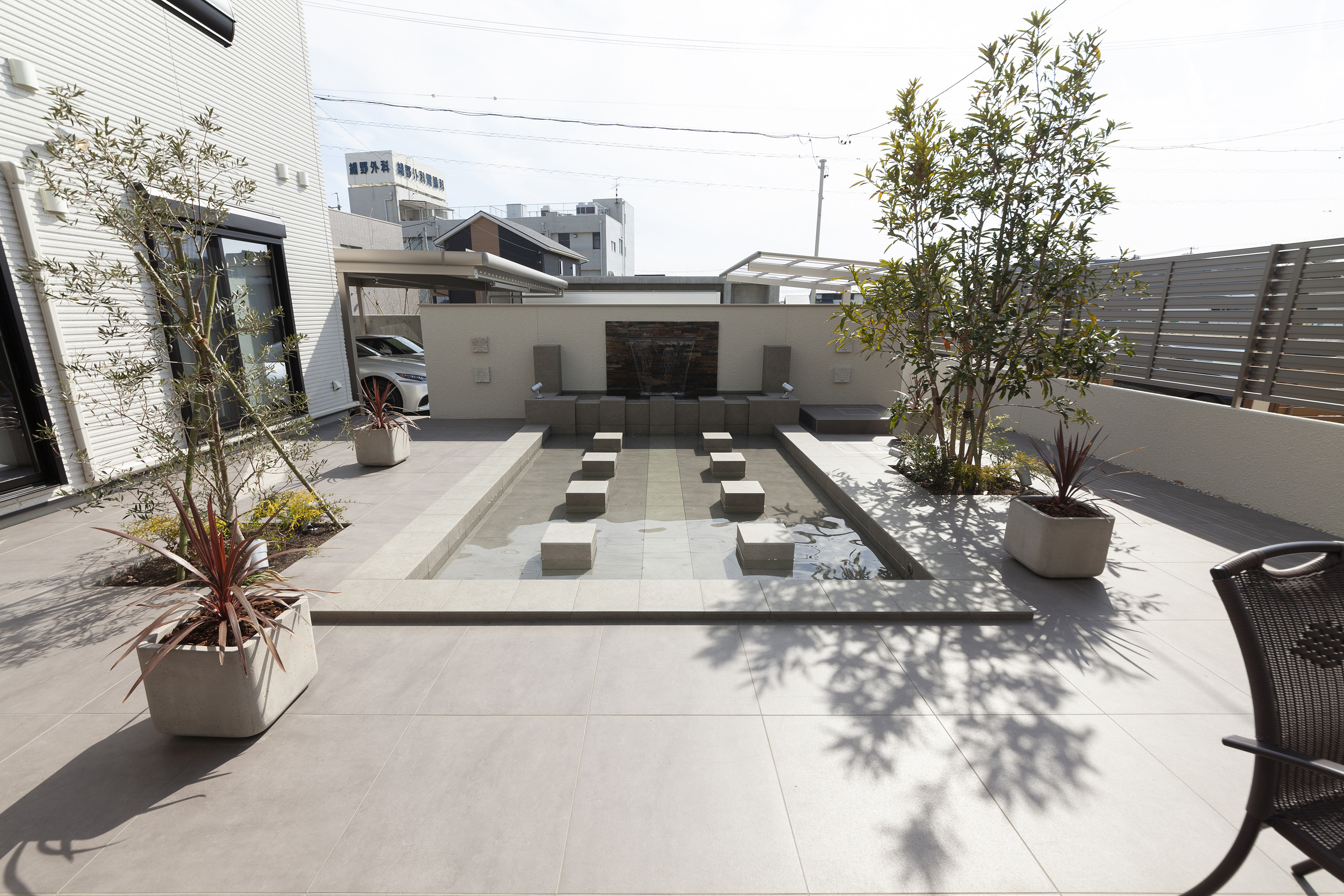 こちらは、当社の平屋の宿泊展示場の中庭に併設してあるウォーターガーデンになります。