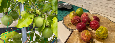 右の写真はパッションフルーツの実を取り完熟させている写真です。実が赤くなり表面にしわが出てきたら食べごろです。