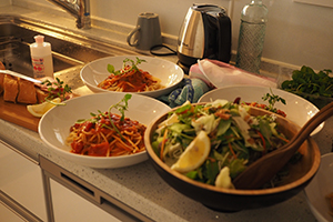 前日に食材の買い出しを行ない、当日は早朝からパスタを茹でて、