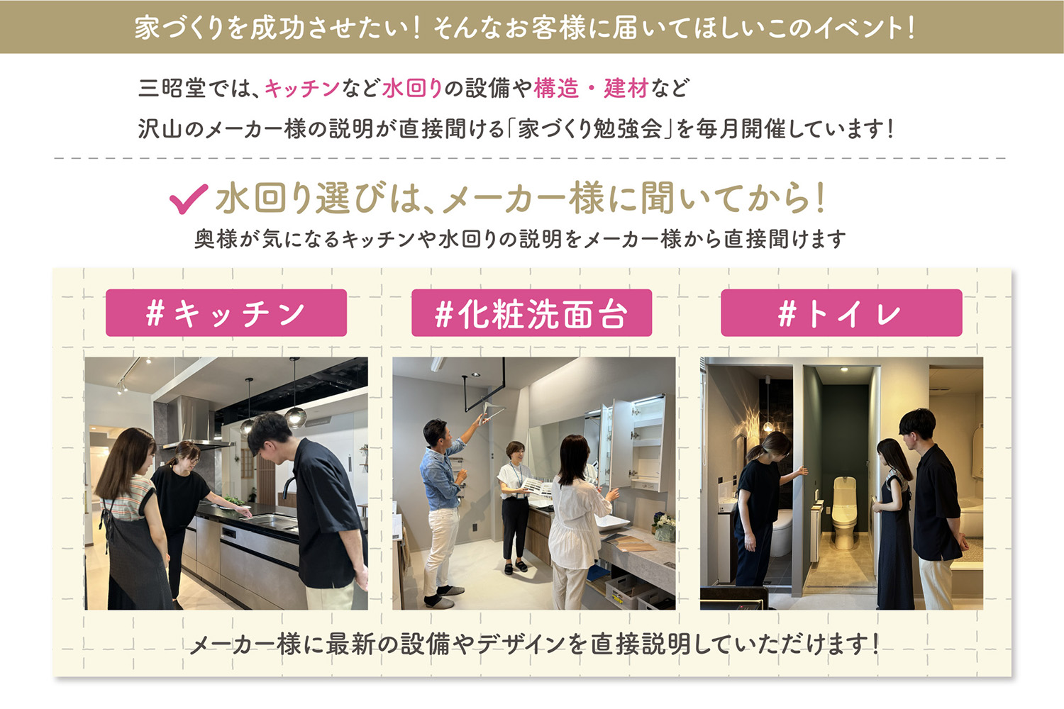 三昭堂では、 キッチンなど水回りの設備や構造・建材など沢山のメーカー様の説明が直接聞ける「家づくり勉強会」を毎月開催しています。