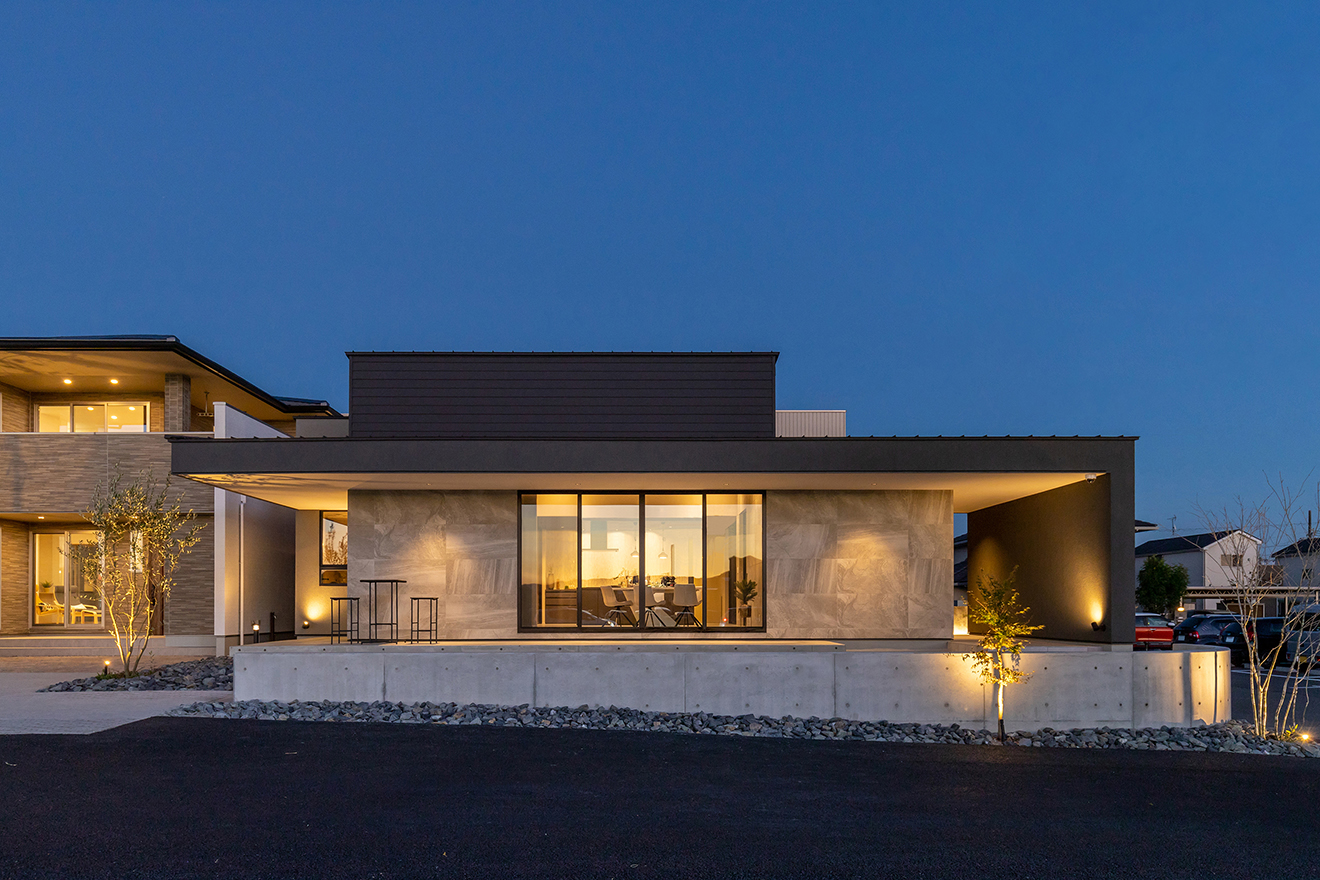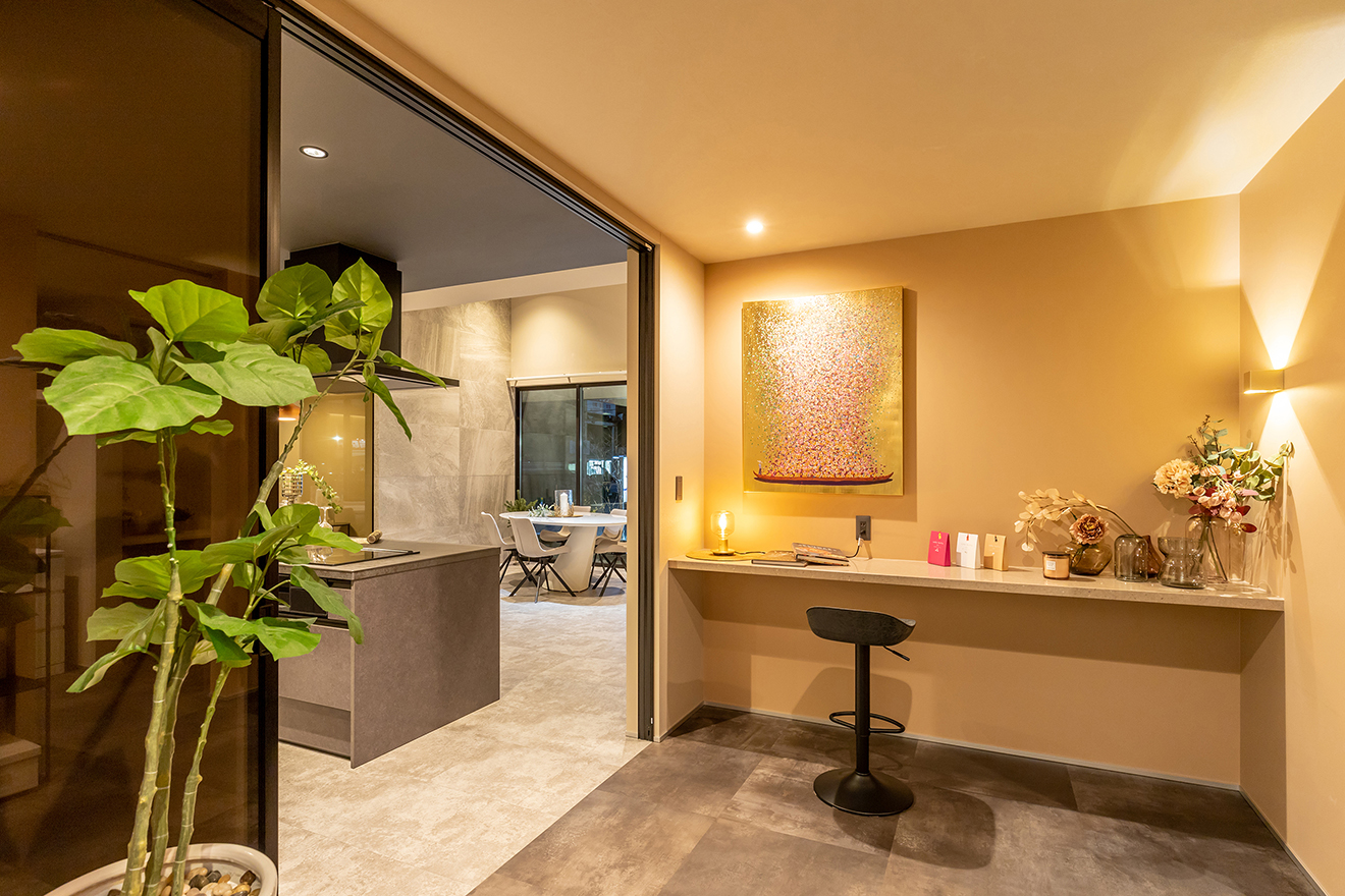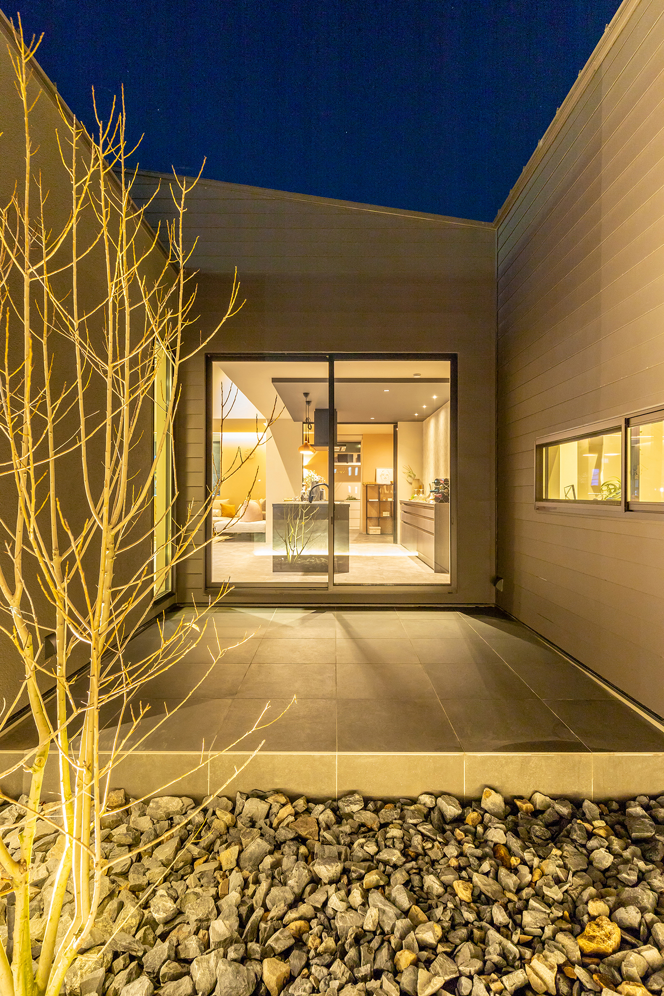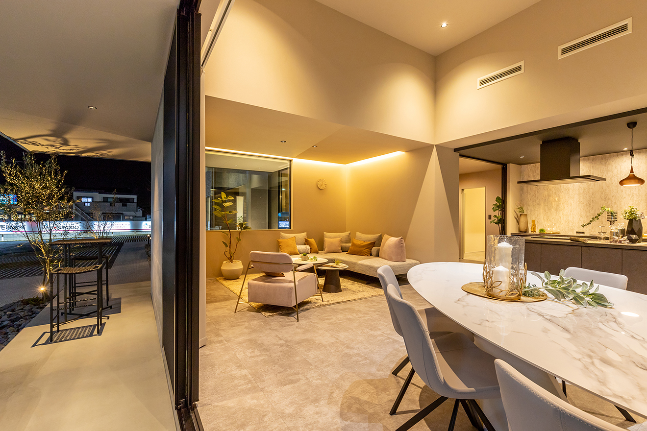 【夜景・中庭】LDKとフラットに繋がる中庭はアウトリビングとしても最適。 【夜景・LDK】間接照明がグレーや黒を中心としたLDKをより印象的に照らします。