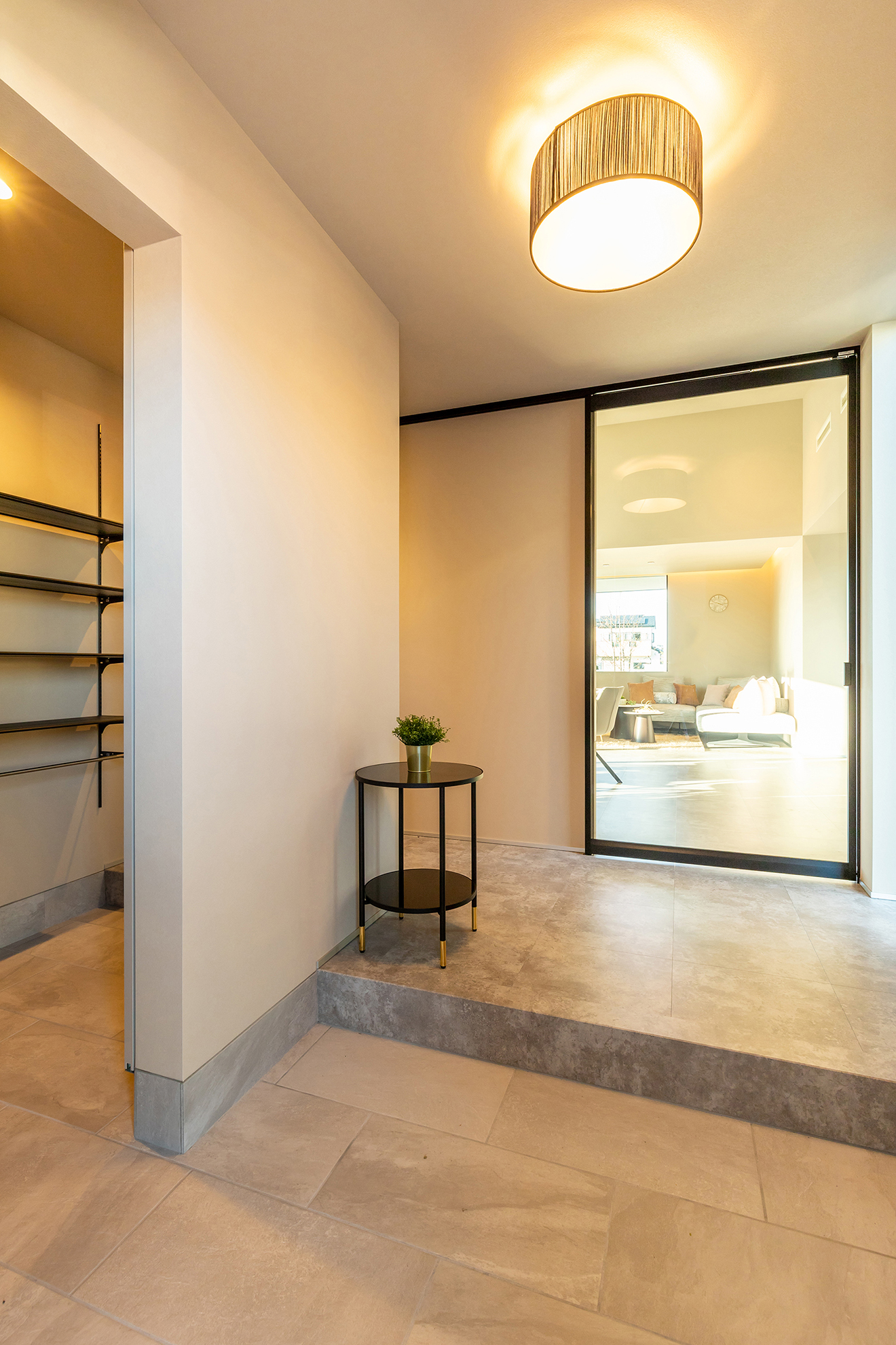 【玄関・玄関ホール】通り抜け可能なシューズクロークを設けました。靴以外にもベビーカーや小物を収納できるので、玄関周りがスッキリ整います。