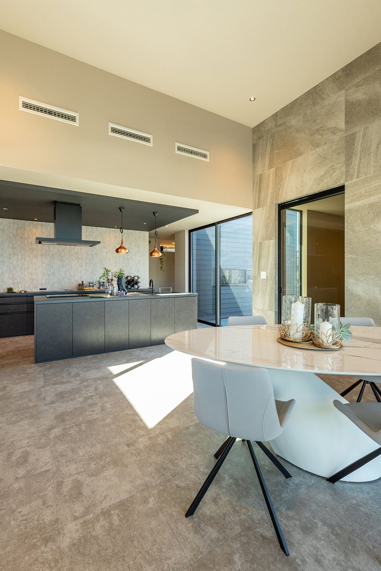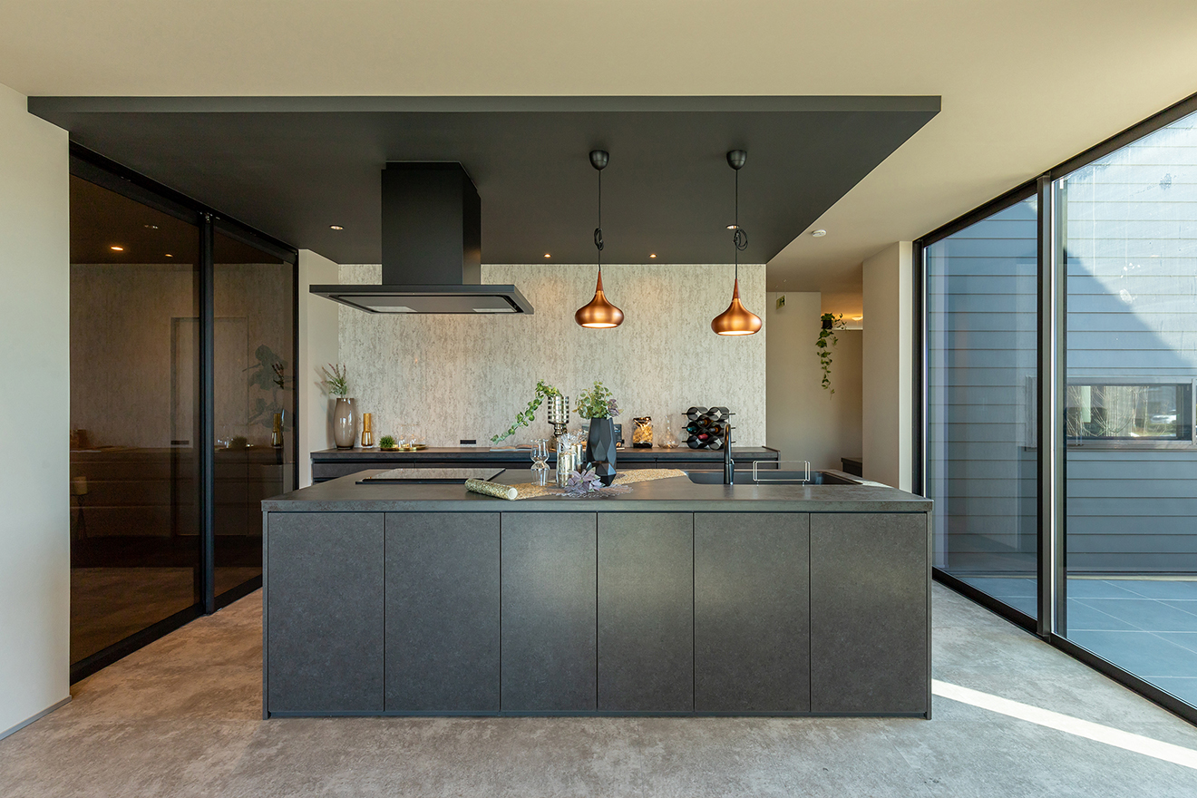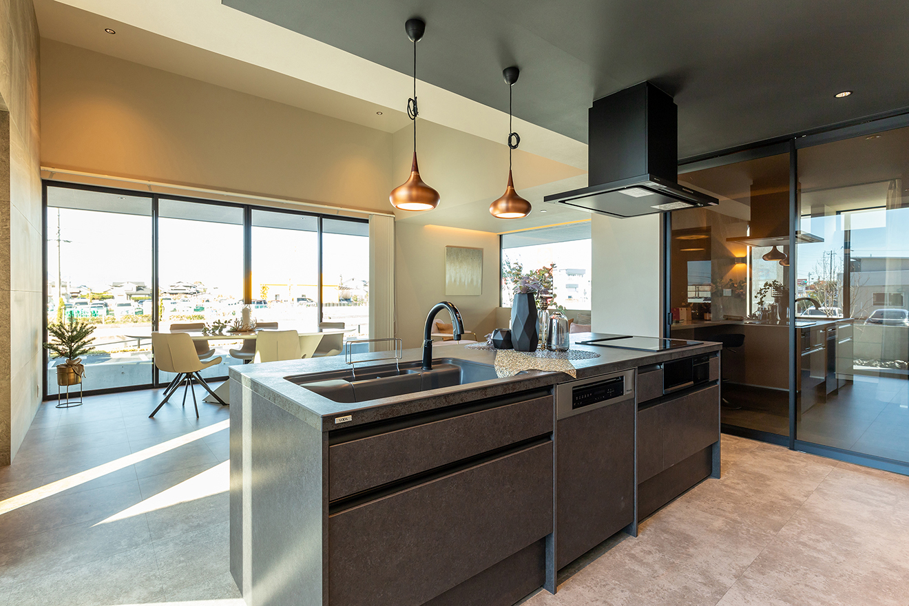 【LDK】高天井の空間をコンクリートグレーの床で引き締めた、個性的でモダンなリビング。グレーの室内に黒で統一したキッチンは、スタイリッシュで洗練された雰囲気に。