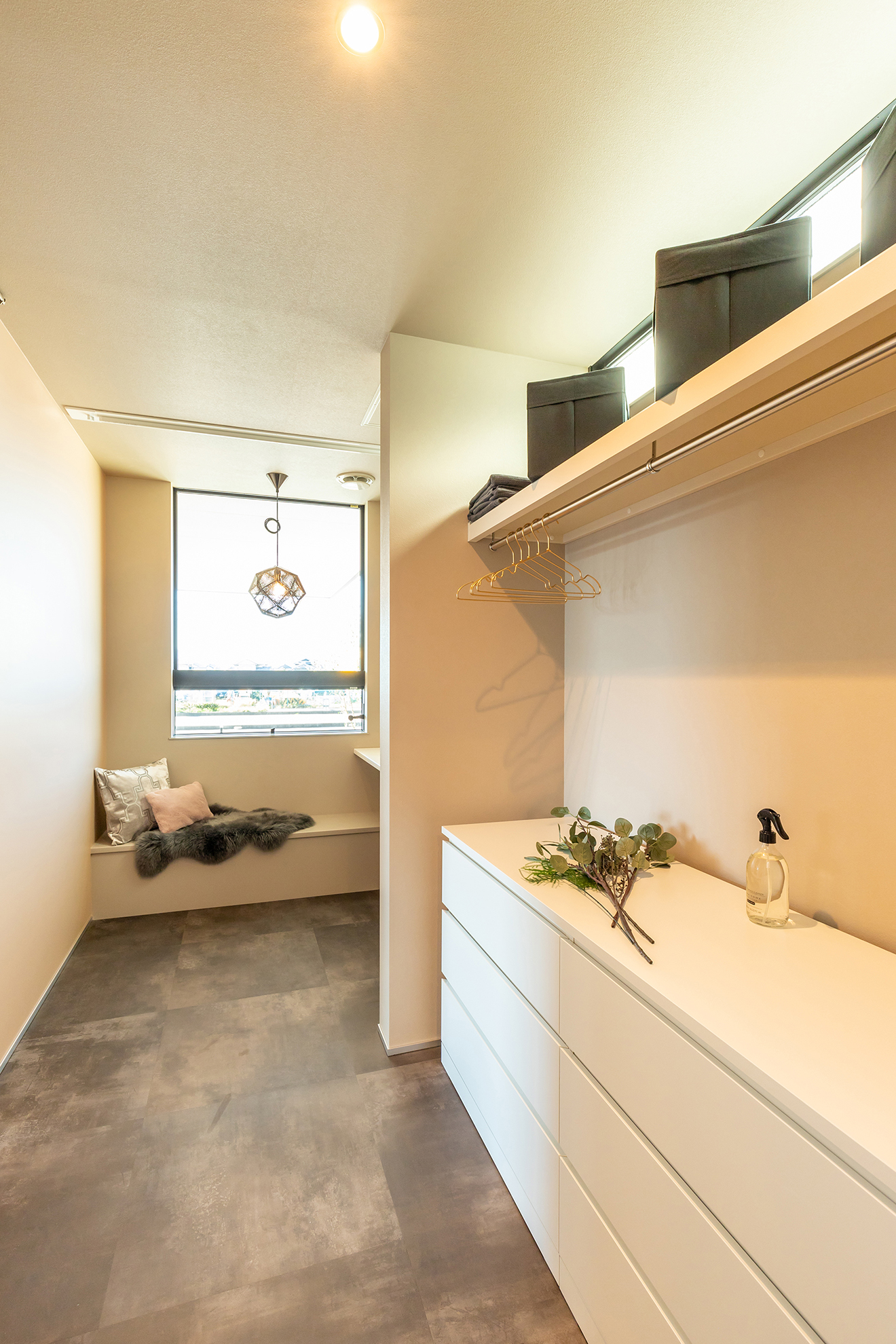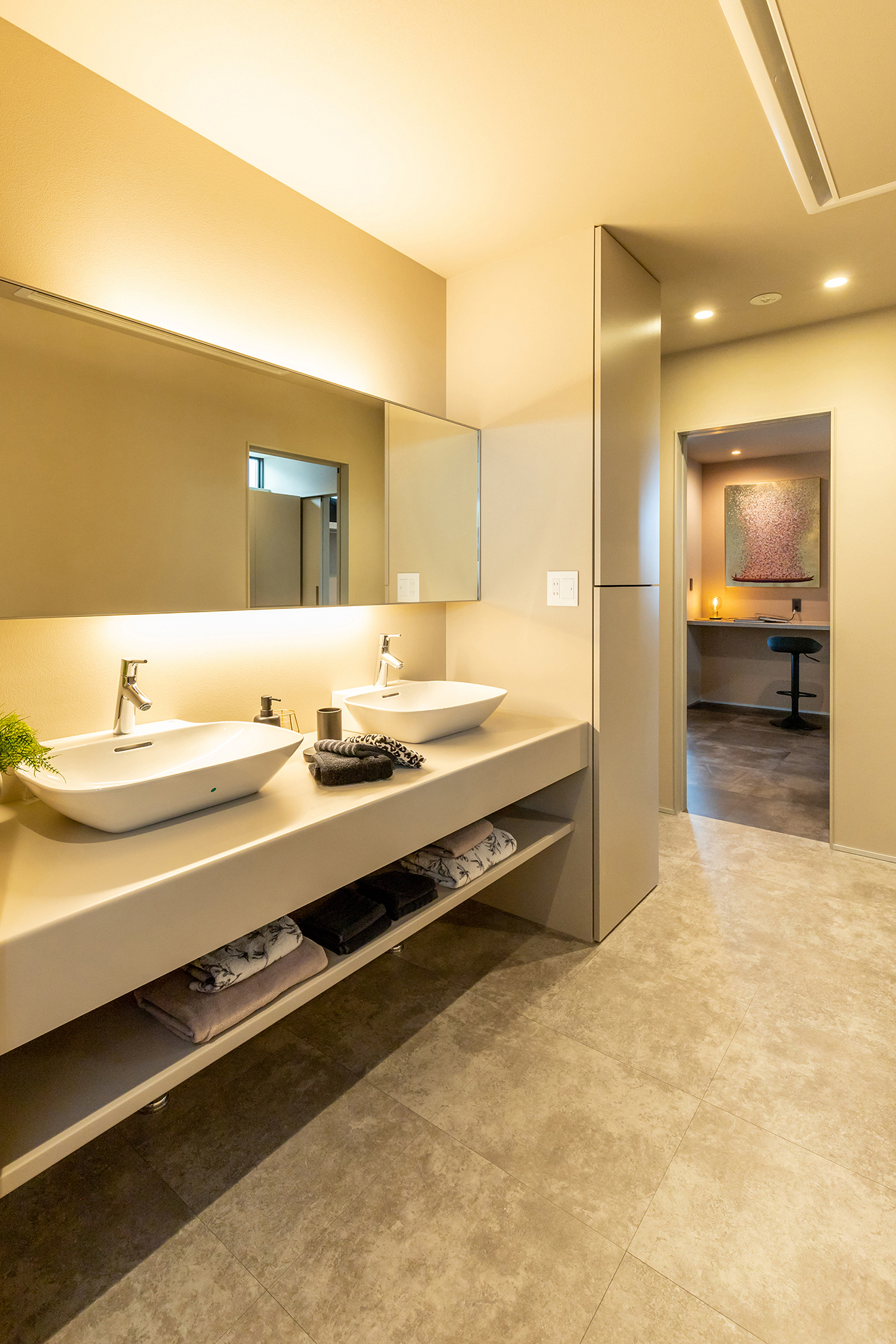 【ファミリークローク】さっと使えるよう、居室間に家族共有のファミリークロークを設けました。 【洗面】2人並んでもゆったりと使える造作洗面台。横には使い勝手の良い収納を取り付けました。間接照明でホテルライクな印象に。