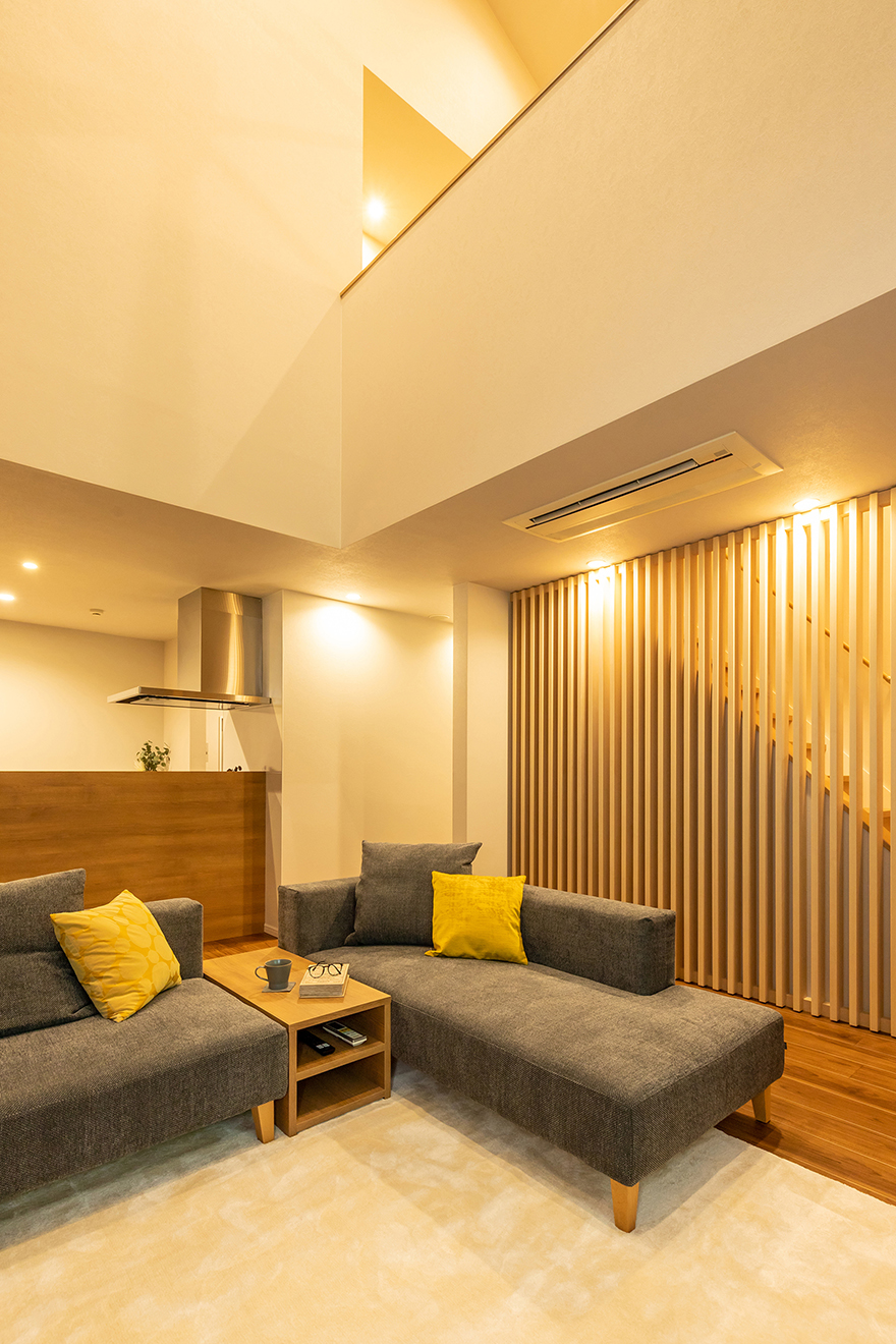【夜景・LDK・主寝室】吹抜けにより、程よい距離感を保ちながら家族の気配を感じることができます。