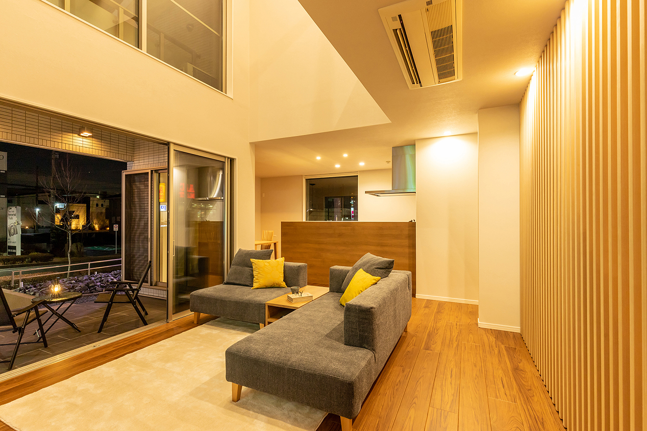 【夜景・LDK】ライトアップされたスリットやタイルデッキが昼間とは違う表情を魅せます。