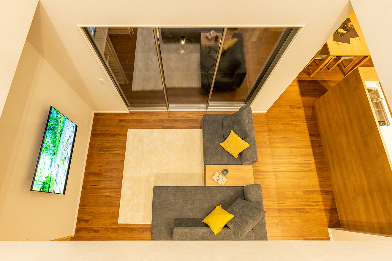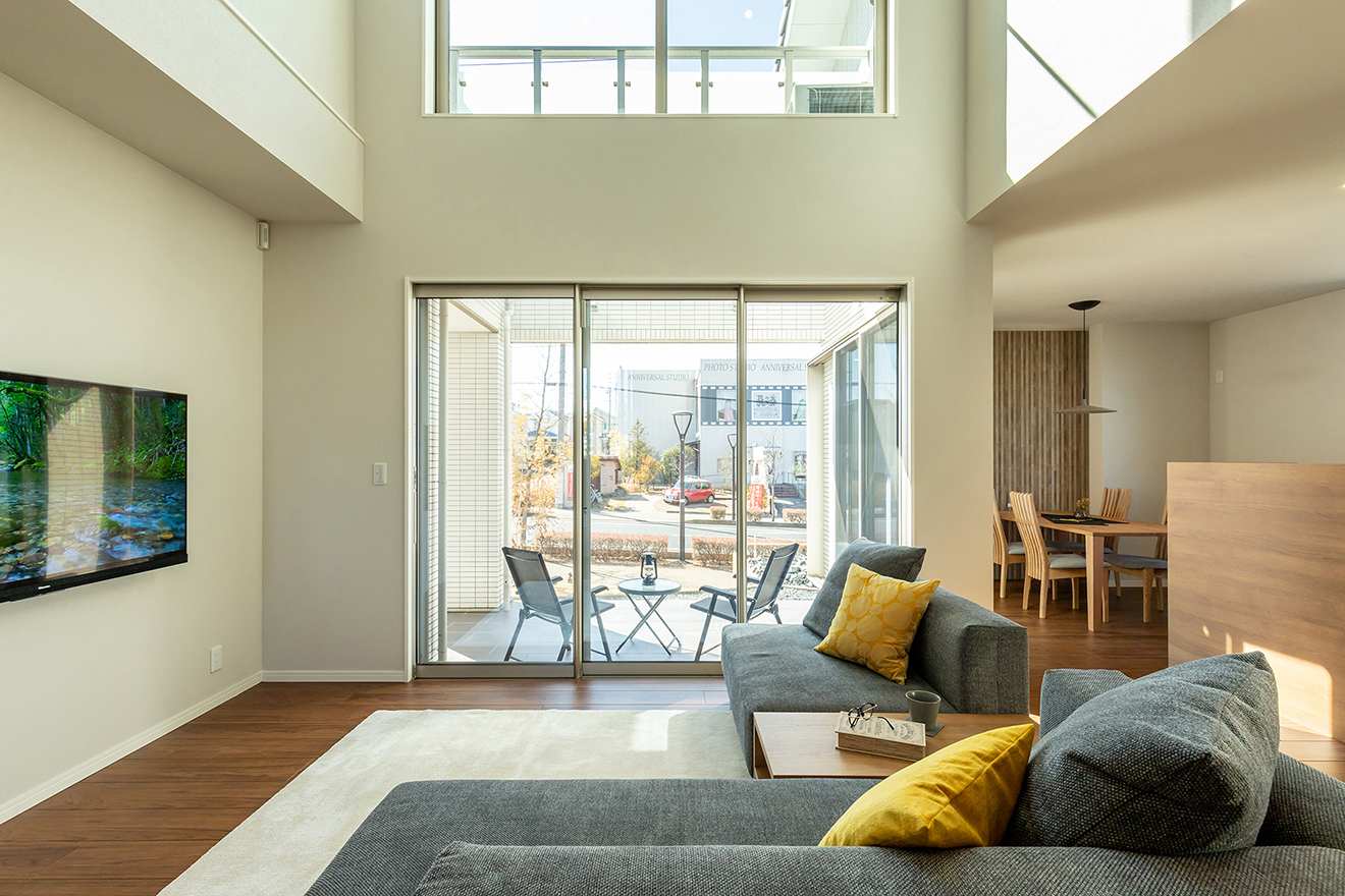 【LDK】開放的な吹抜けから暖かな陽光が差し込むLDK。タイルデッキとの一体感によって、より広がりを感じる空間に仕上がりました。