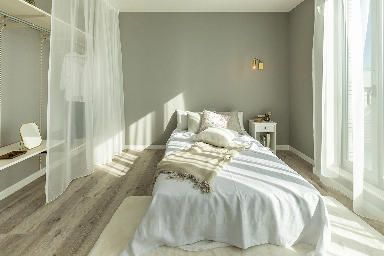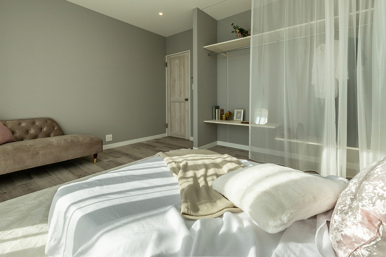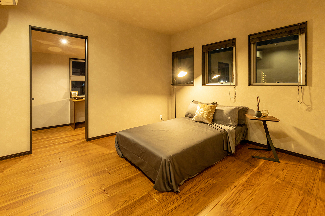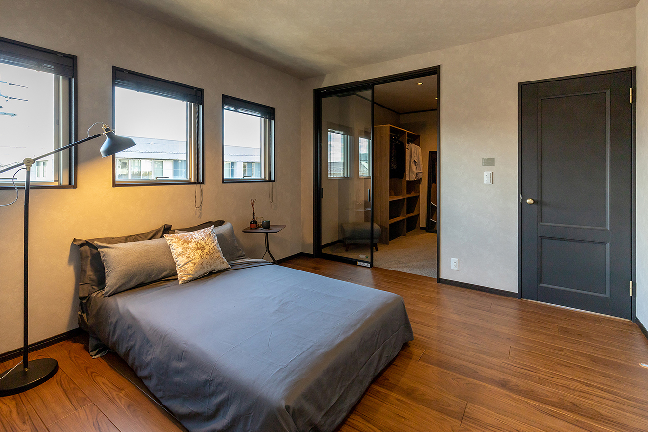 【主寝室】落ち着いた雰囲気の主寝室にシックな装いのWICと書斎を併設しました。