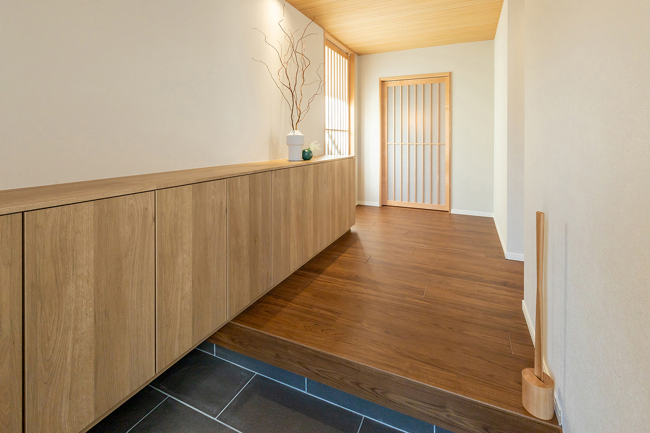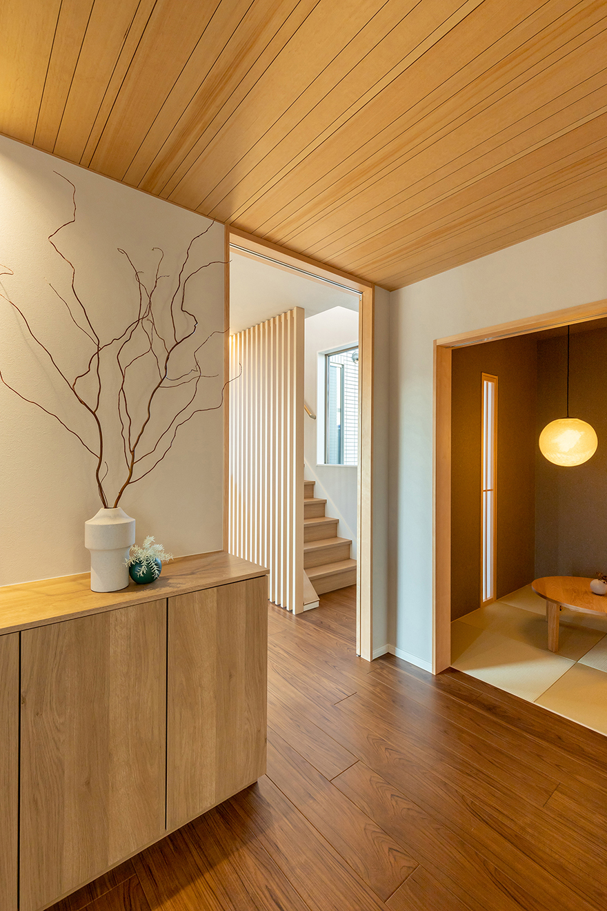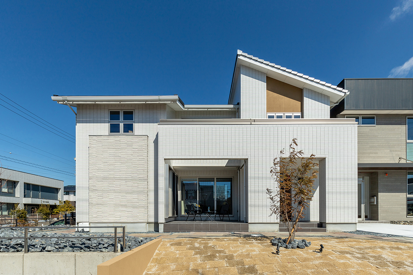 【外観】白タイルを用いた清潔感のある外観。 【玄関】天井を下げて羽目板を貼った落ち着いた雰囲気の玄関。奥行きがあり、開放的な印象を与えます。