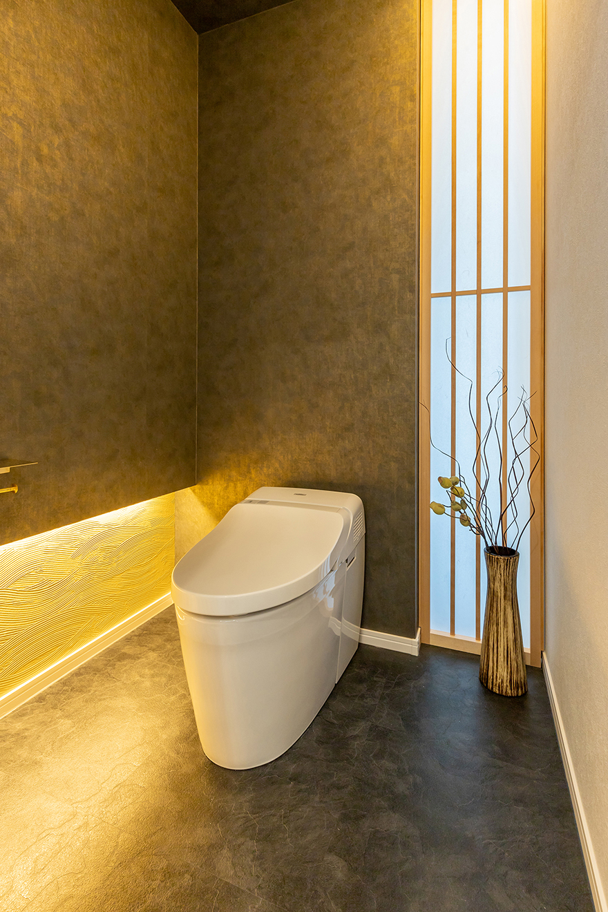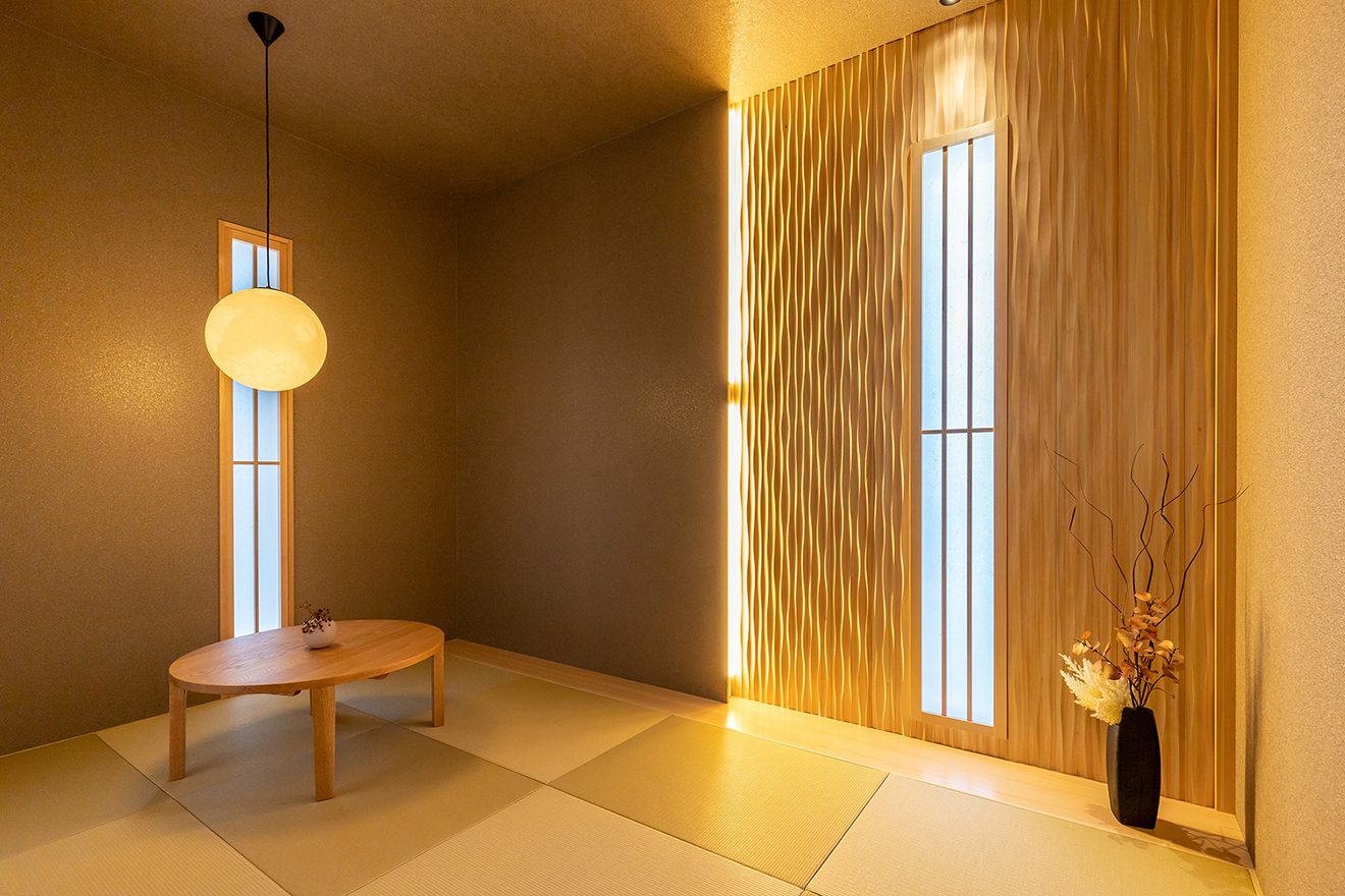 【和室】全体を柔らかい明かりで照らし、癒やしの空間に仕立てました。テレワークや客間スペースとしても活用できます。