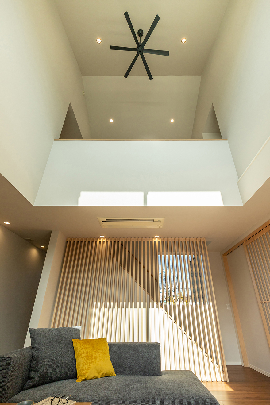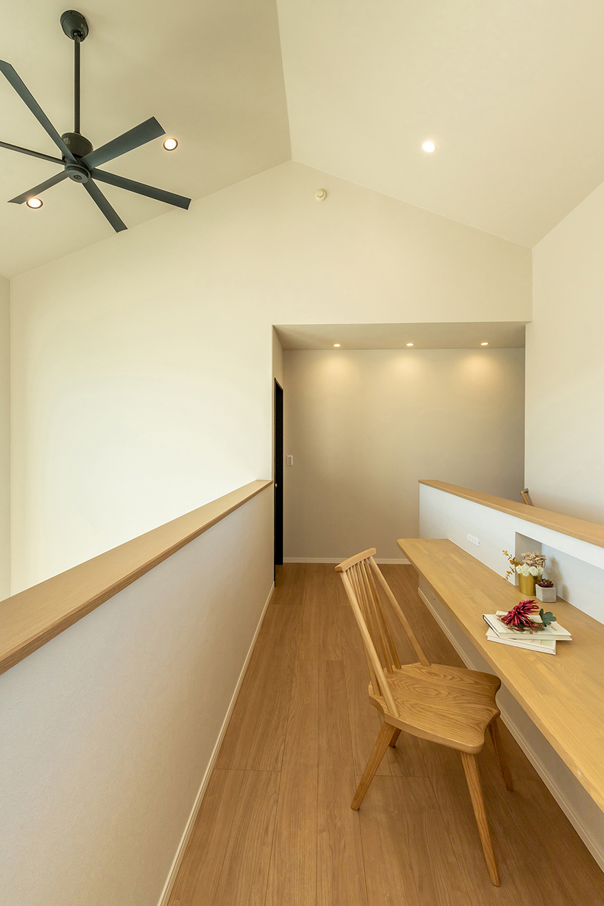 【LDK】階段部に設けた木製のスリットがアクセントに。 【2階ホール】吹抜けや階段を通じて家族の気配を感じつつ、勉強や読書を楽しめるカウンターを設置しました。