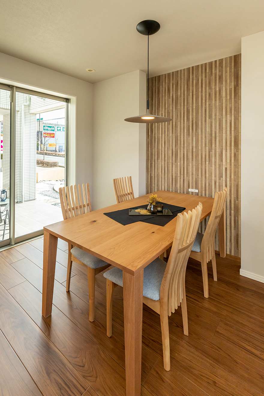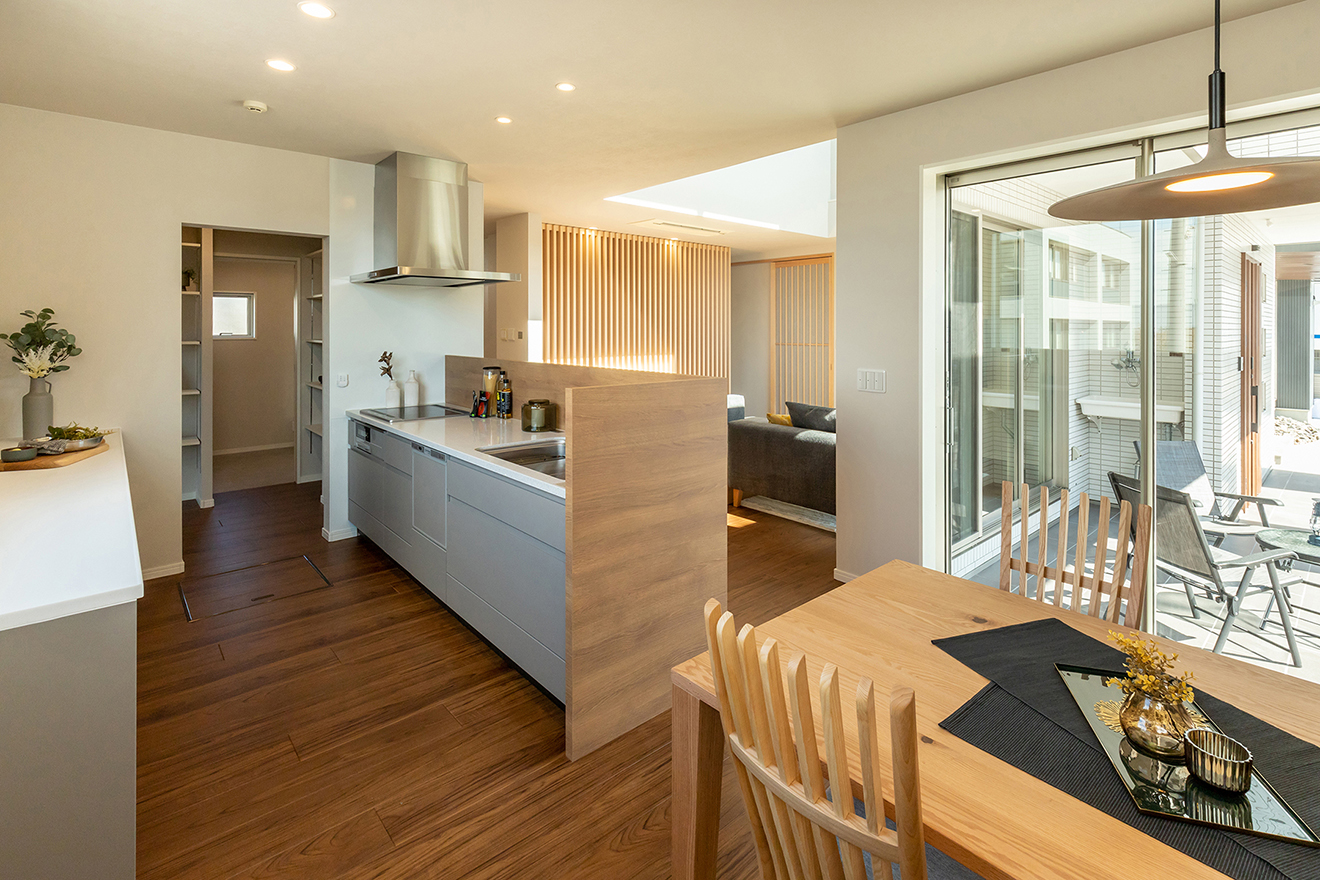 【DK】キッチンからパントリーと脱衣室を繋ぐことで家事動線を楽にしました。ダイニングスペースは和の雰囲気を味わえるエコカラットを採用。