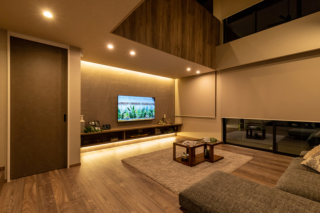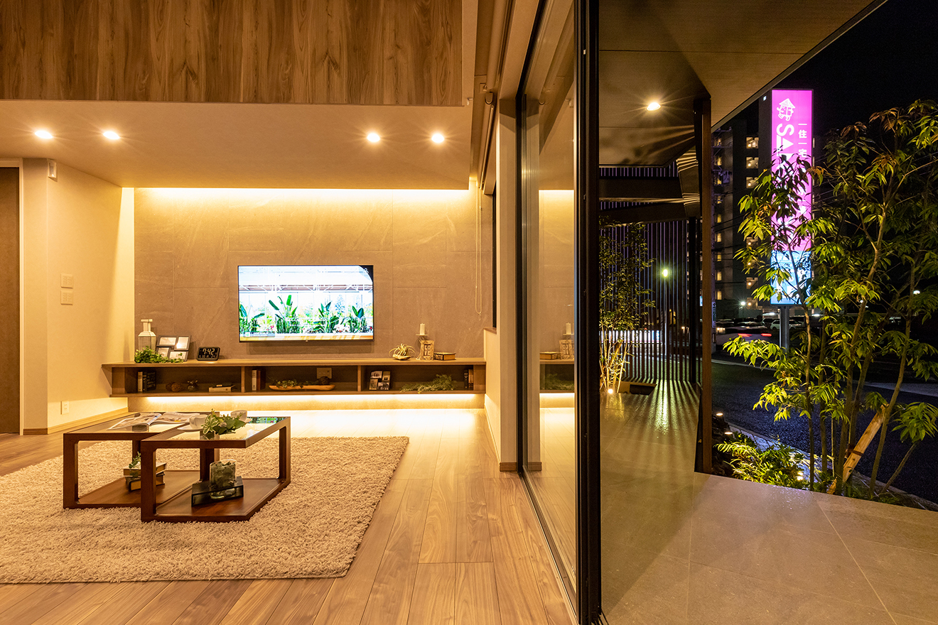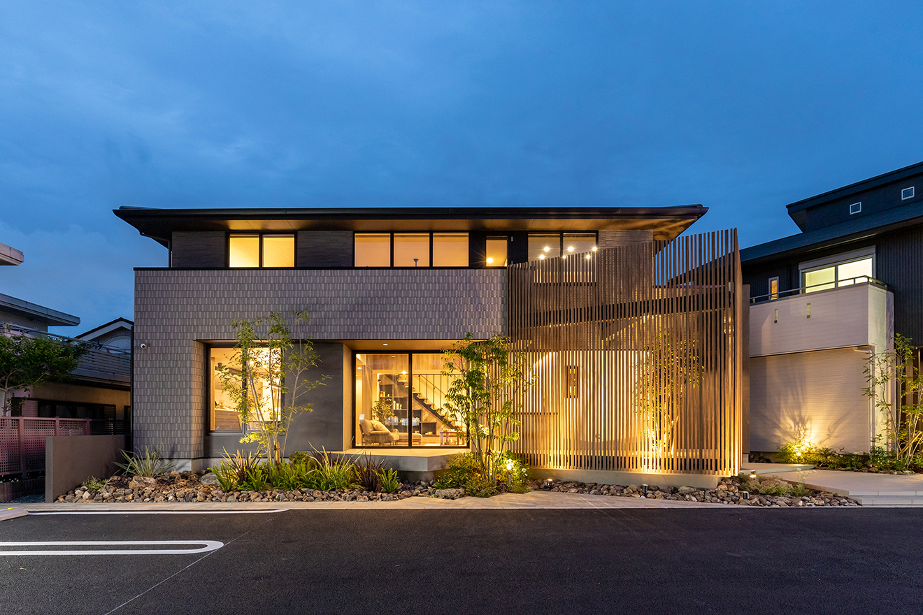 【夜景・外観】ライトアップされた縦格子が、昼間とは異なる表情を魅せます。リビングには電動ロールスクリーンを設けました。