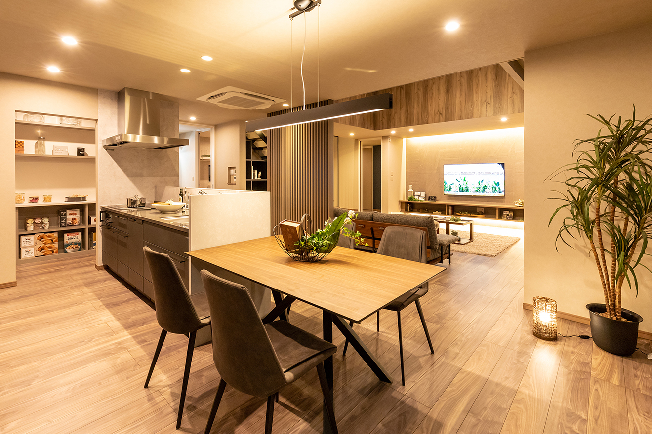 【夜景・LDK】落ち着いた色調のインテリアにまとめることで、ゆったりとした大人リッチな雰囲気に仕上がりました。