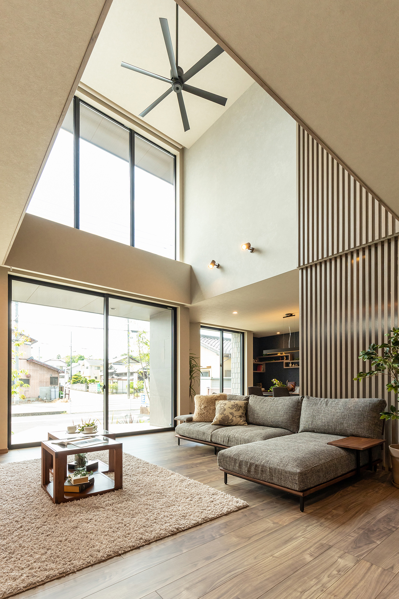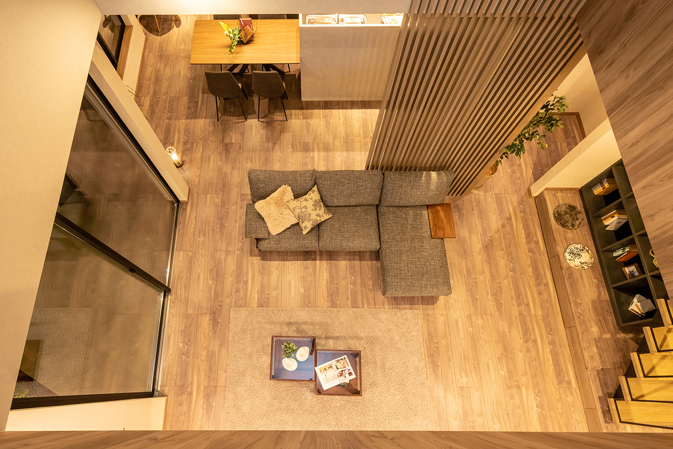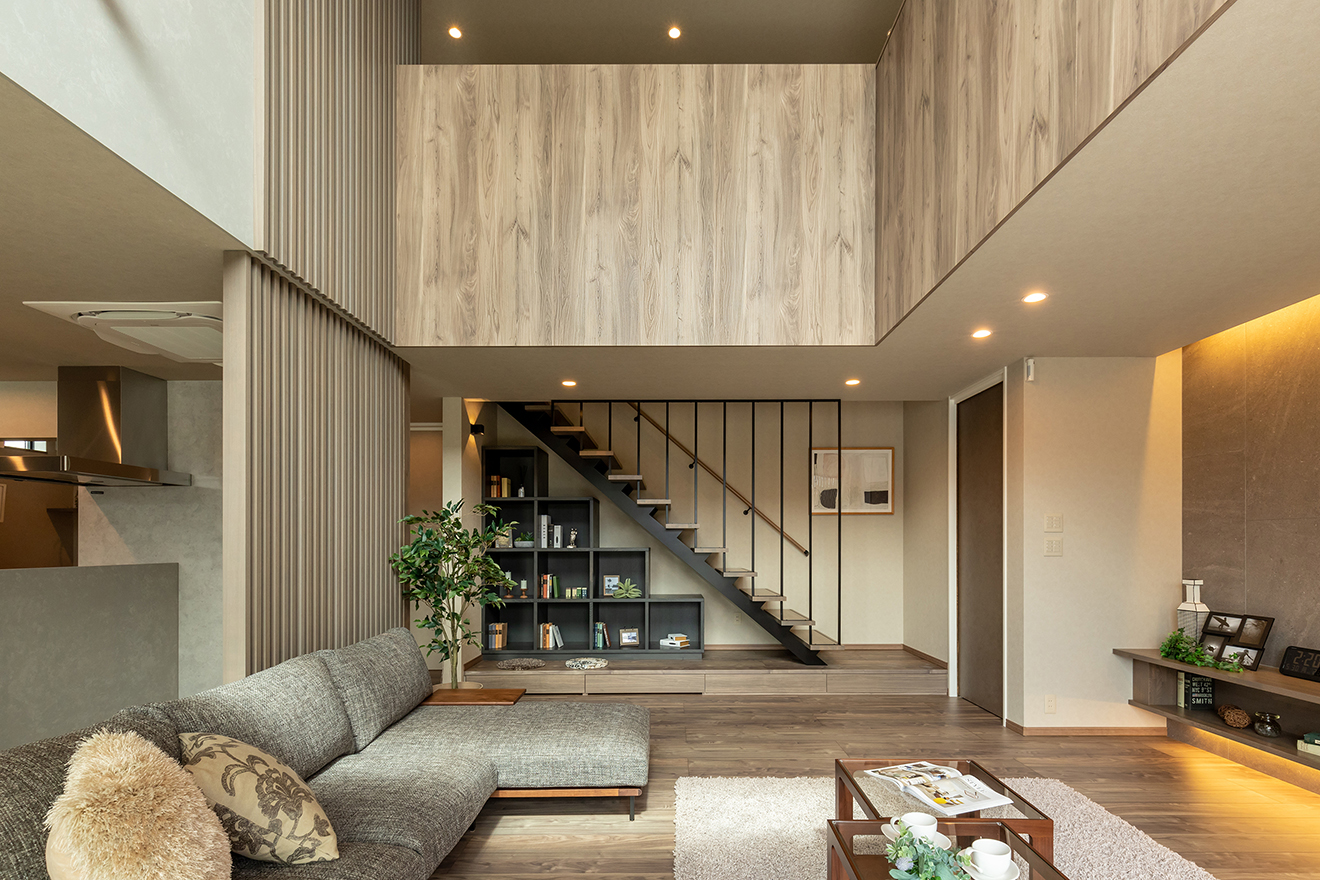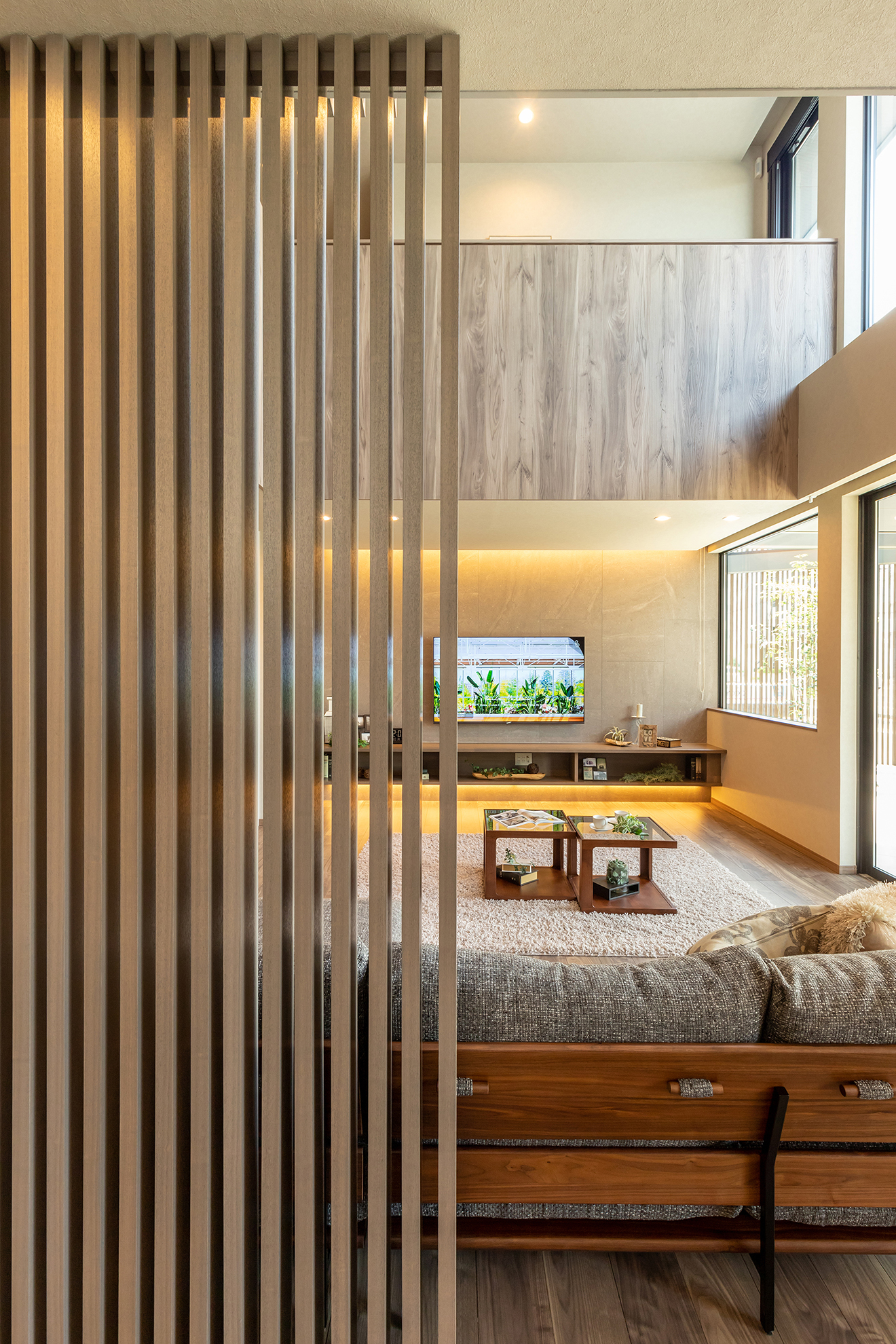 【LDK】2階まで続く木製ルーバーがアクセントになり、開放的な空間を引き締めています。