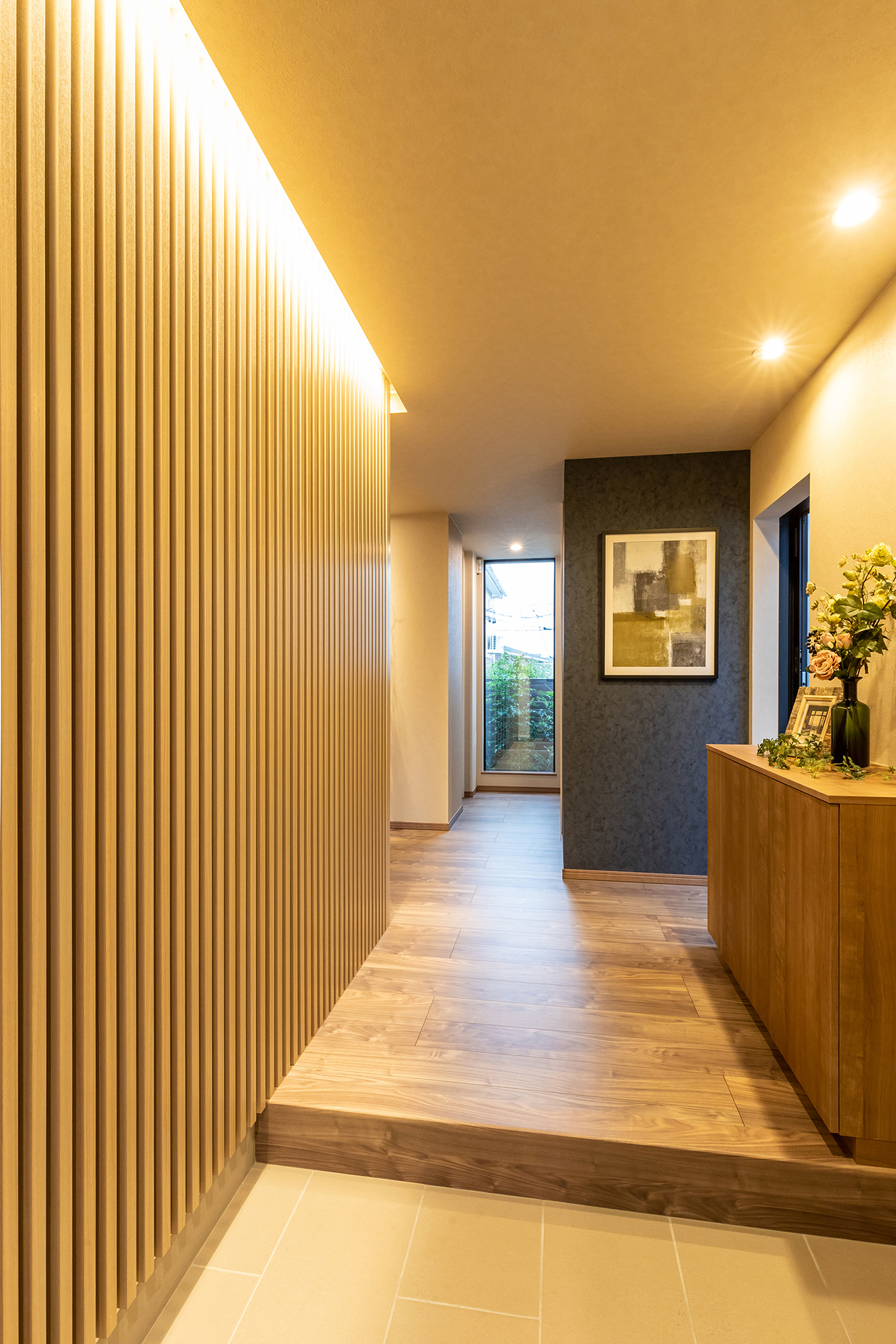 【外観】縦格子で程よく囲まれた外部スペースは『あいまいな空間』として、リビングと庭を豊かに繋ぎます。 【玄関】スッキリとした木製の縦ルーバーがお出迎えする玄関ホール。