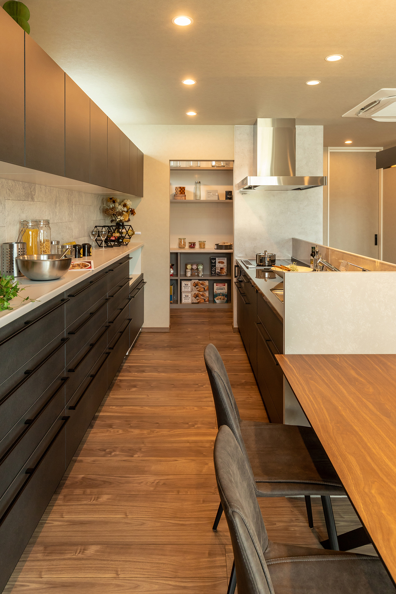【キッチン】手元が見えないのでスッキリとした印象を与えるキッチン。広々としたパントリーには食材や日用品に加え、冷蔵庫も収納いただけます。