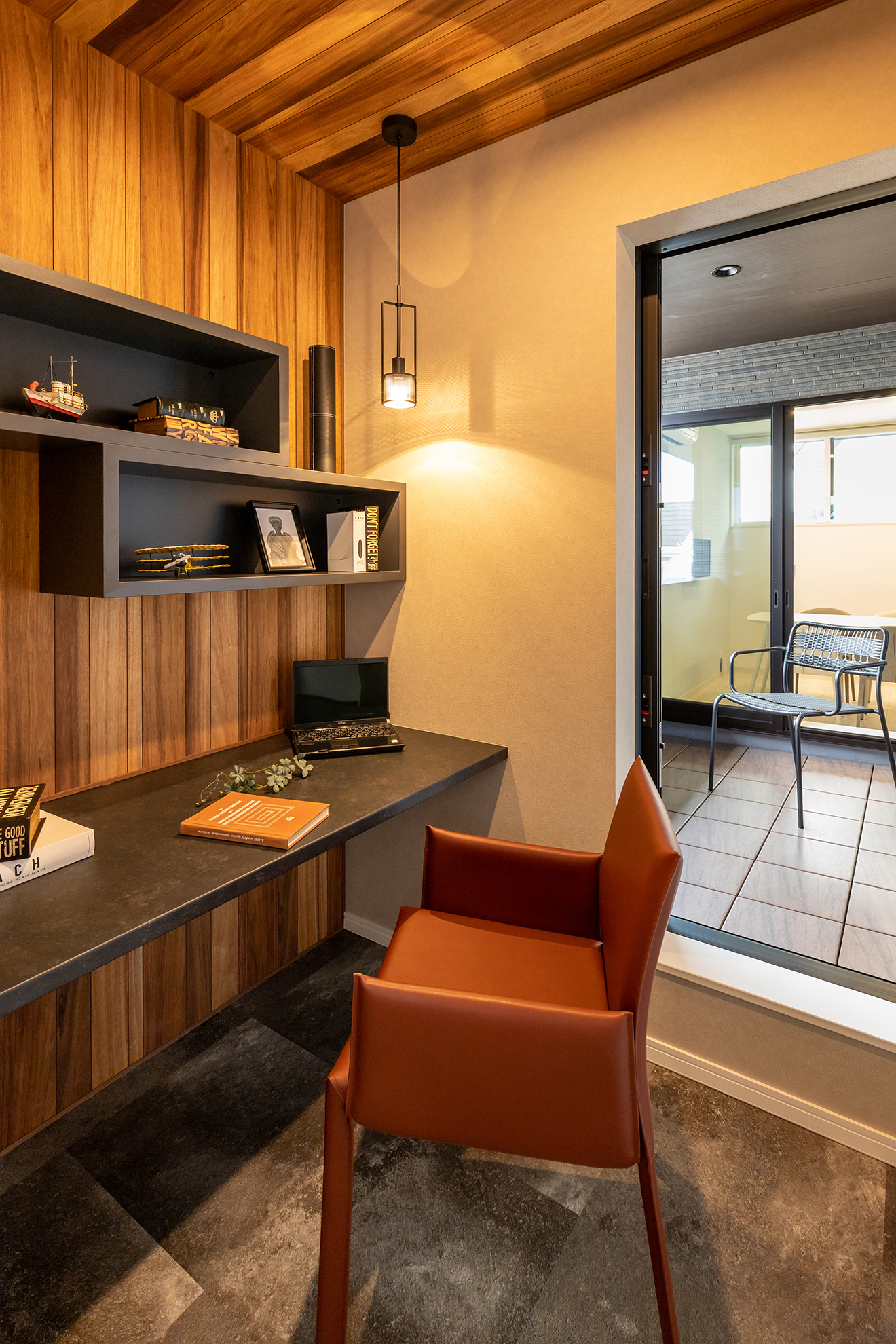 【洗面】トイレ・手洗い・ファミリークローゼット・ユーティリティ・洗面脱衣室を一本の動線で結びました。 【書斎】木製パネルを天井と壁に施した空間は、テレワークなど集中したい時にピッタリです。