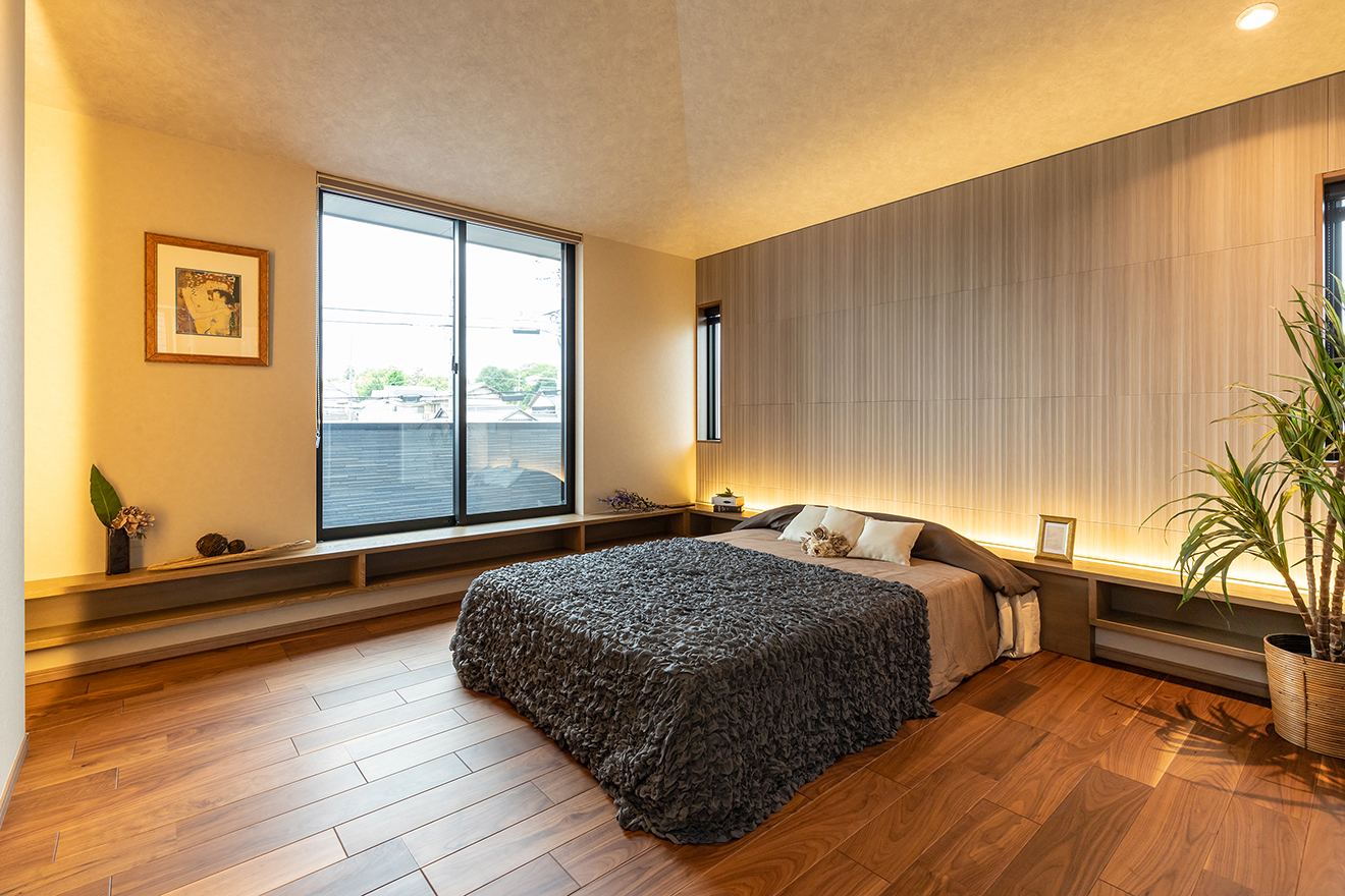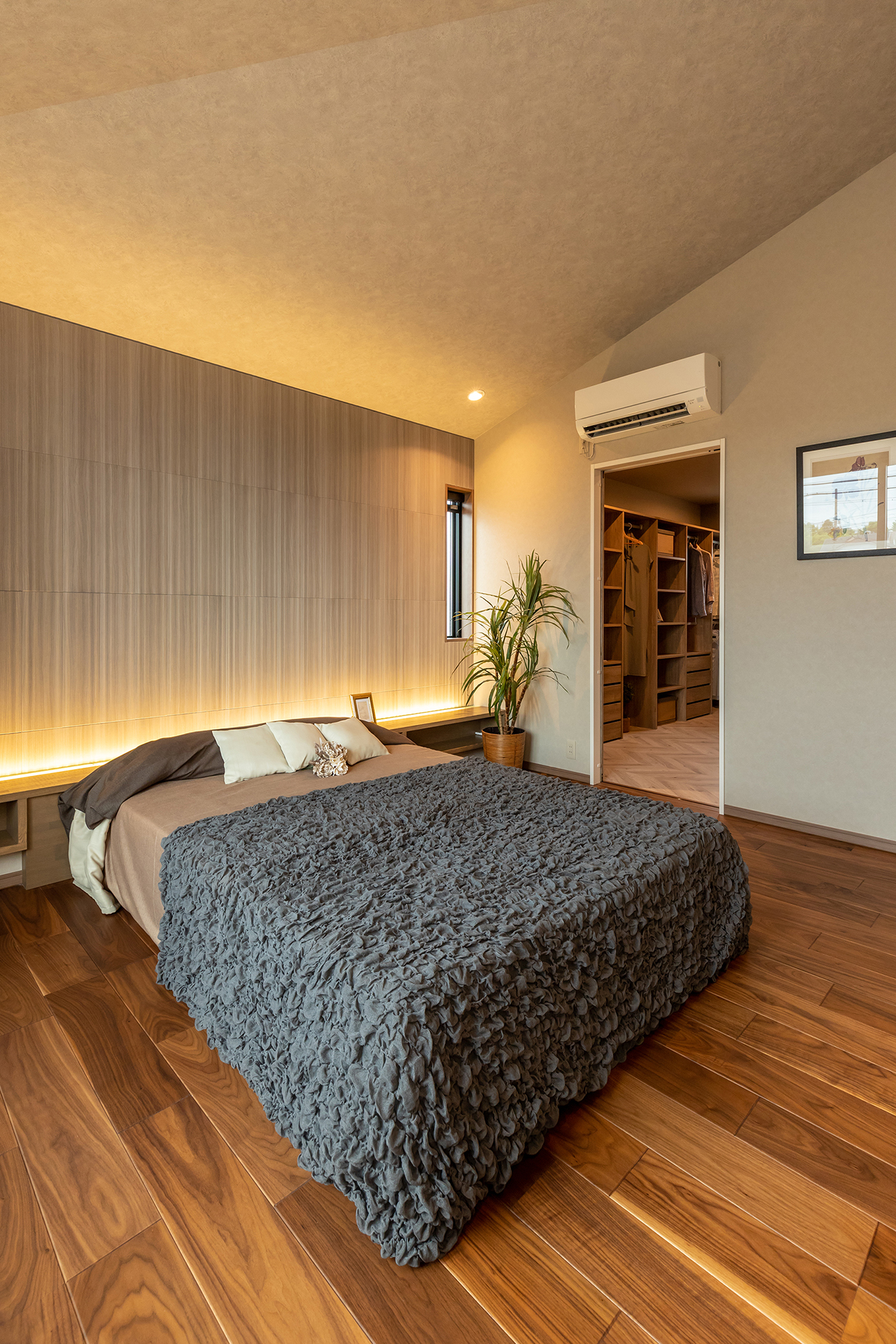 【主寝室】勾配天井とエコカラット、間接照明などでまとめた、落ち着いた雰囲気のラグジュアリーな主寝室。