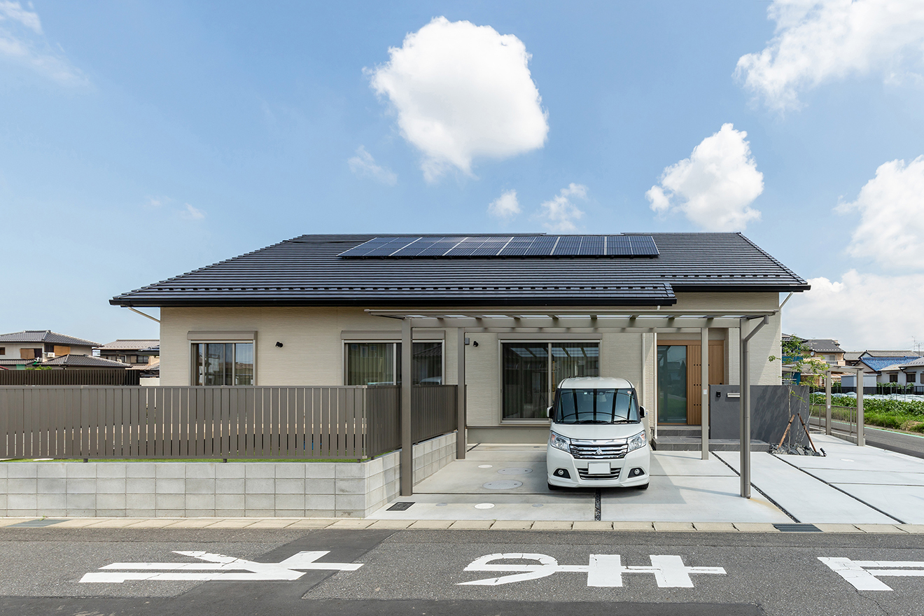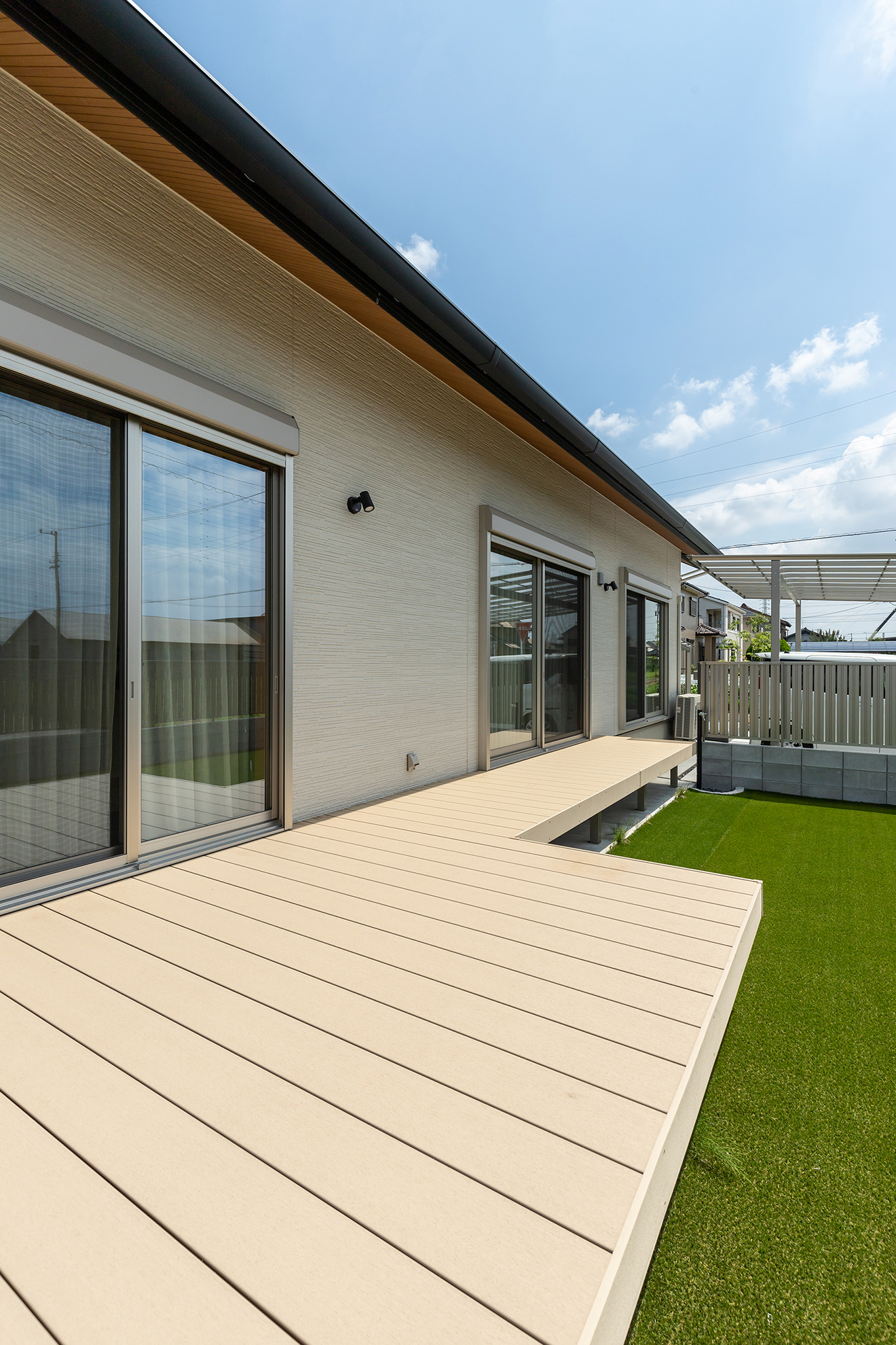 【外観】大屋根のフォルムから木目のルーバーをポイントとして、和の雰囲気溢れるテイストを追求しました。南に広がるウッドデッキは中に繋がるLDKと一体的に利用できる便利なアイテムです。