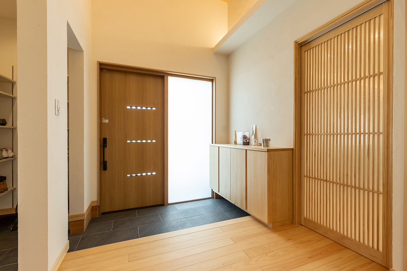 【玄関】玄関には勾配天井と間接照明を設け、狭いイメージを払拭した開放的な空間にまとまりました。