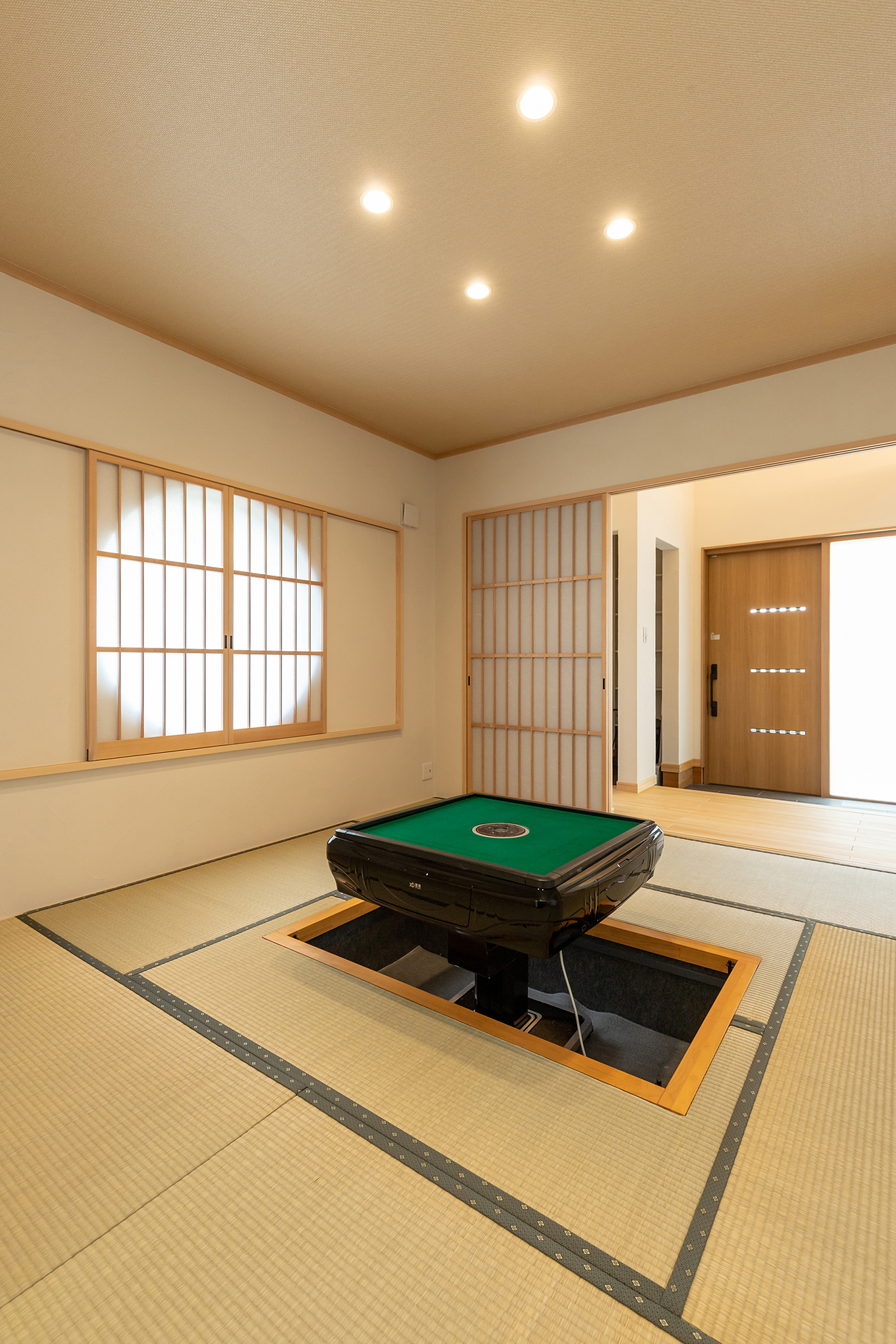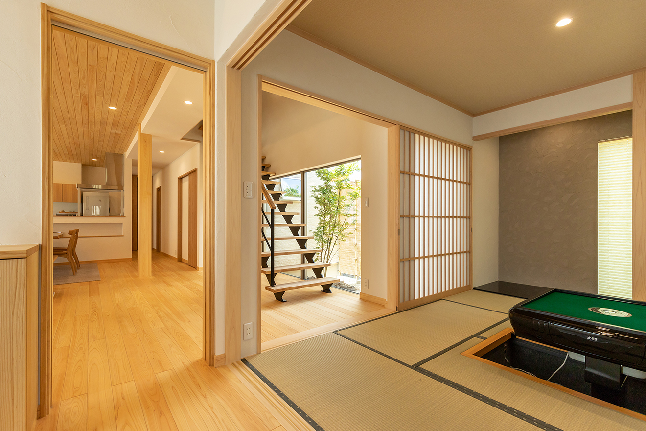 【和室】エントランスから一体で利用できる和室。使いやすいオールシーズンの堀こたつを採用した落ち着きある雰囲気が魅力です。和室とLDKは中庭を挟んで一体的に利用できるよう、建具を開放的に開けられます。また、和モダンのイメージを損なわないよう障子で仕切っています。