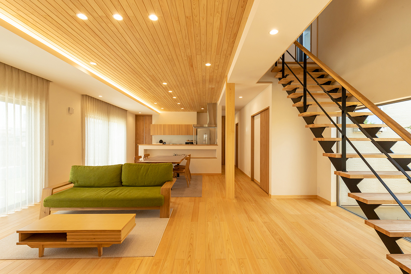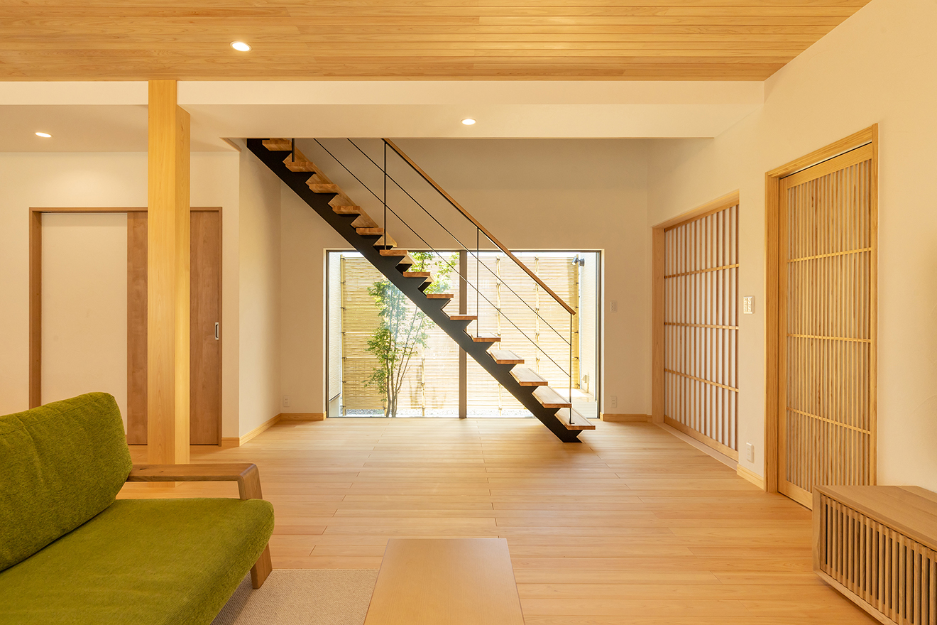 伸びやかなLDKから南面と北面に設けた中庭との繋がりによって、明るく開放的なプランを実現しました。より開放性を持たせる高天井と階段の吹き抜けも合わさり、家族の気配を感じられる設計となっています。随所に設けた桧建材を採用した意匠が、見る癒しだけでなく和の香りも感じれるこだわりの住宅です。