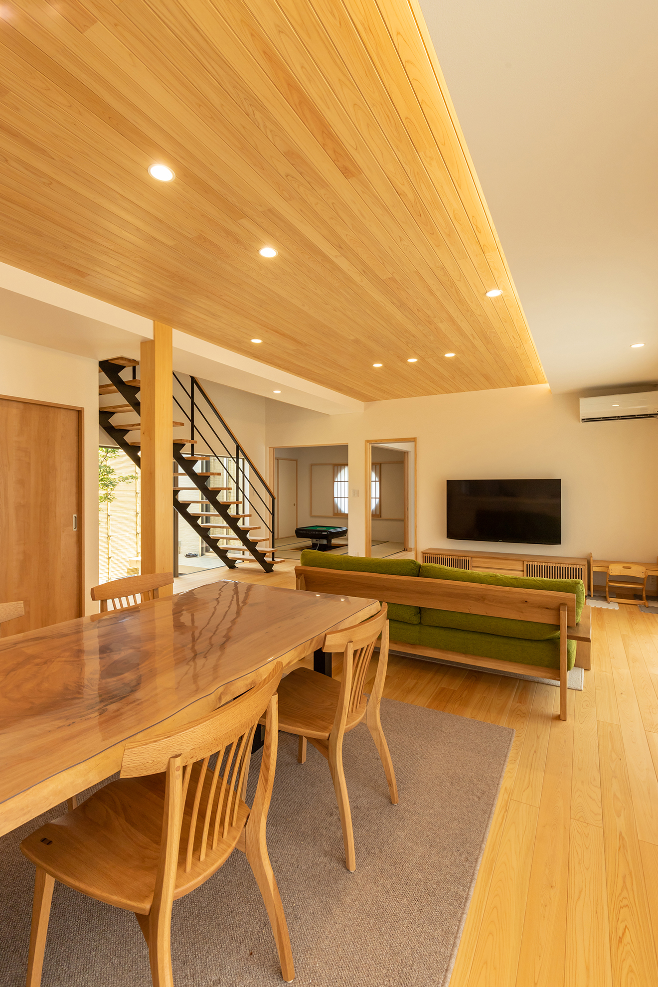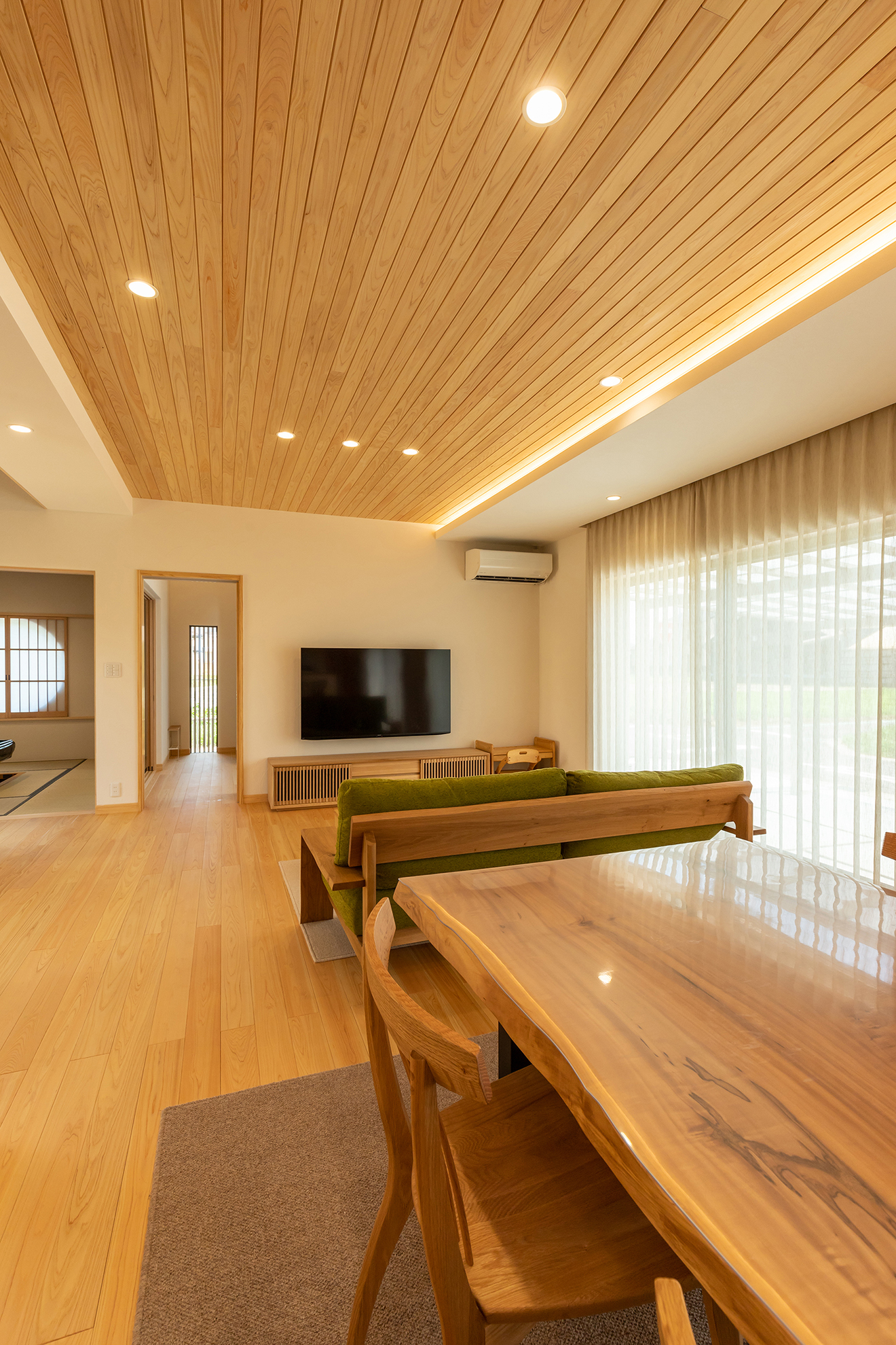 【LDK】キッチンまで繋がるLDKの高天井には桧の羽目板を採用。高級感があり、和の雰囲気を追求した癒しの空間です。