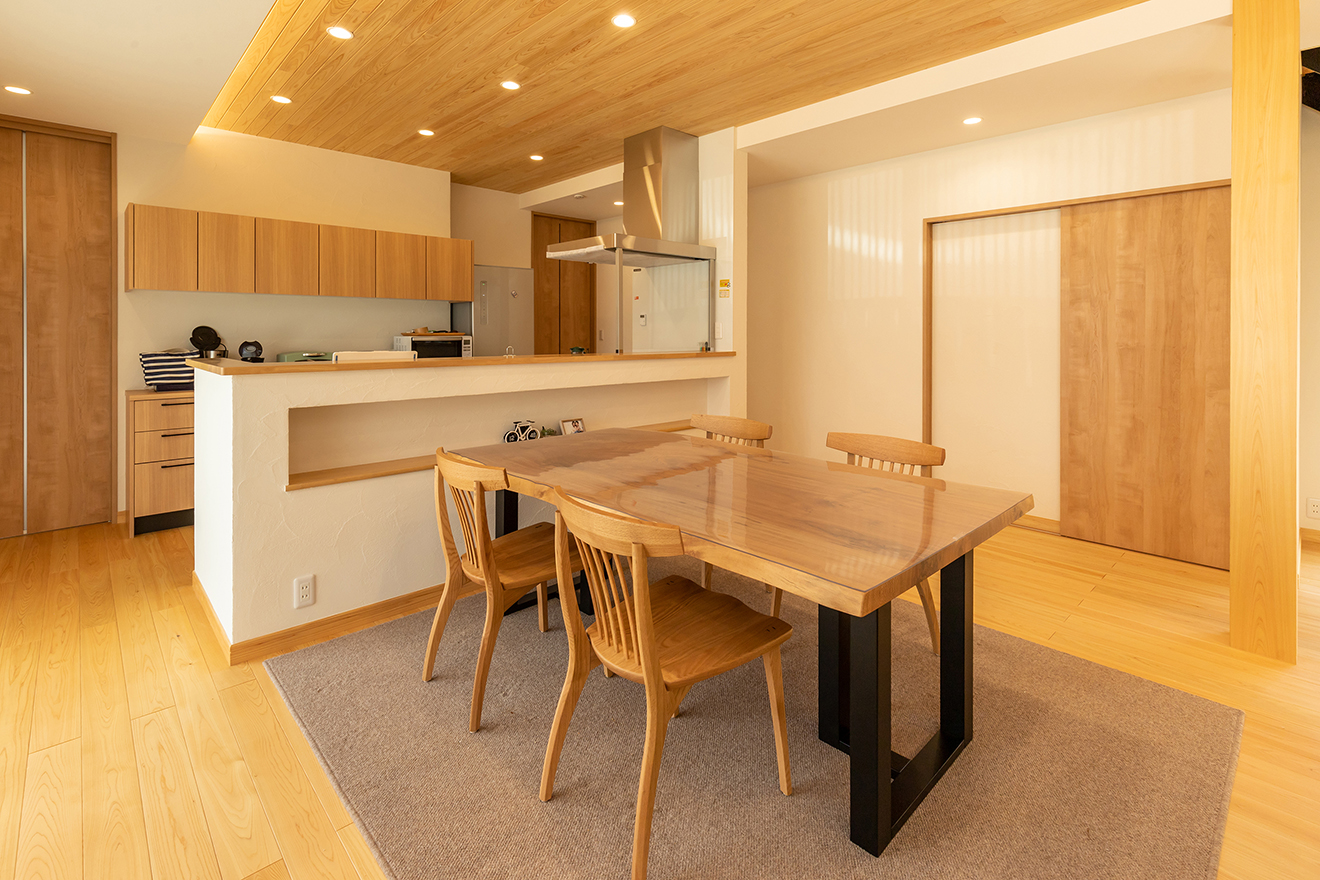 【ダイニング】ダイニング北には6寸の太い桧柱を使用し、力強くも家族のランドマークとなるポイントとなっています。 【キッチン】対話のしやすい対面キッチン。前面にはディスプレイとして活用できるスリットニッチを設けました。
