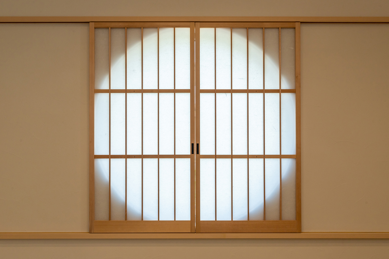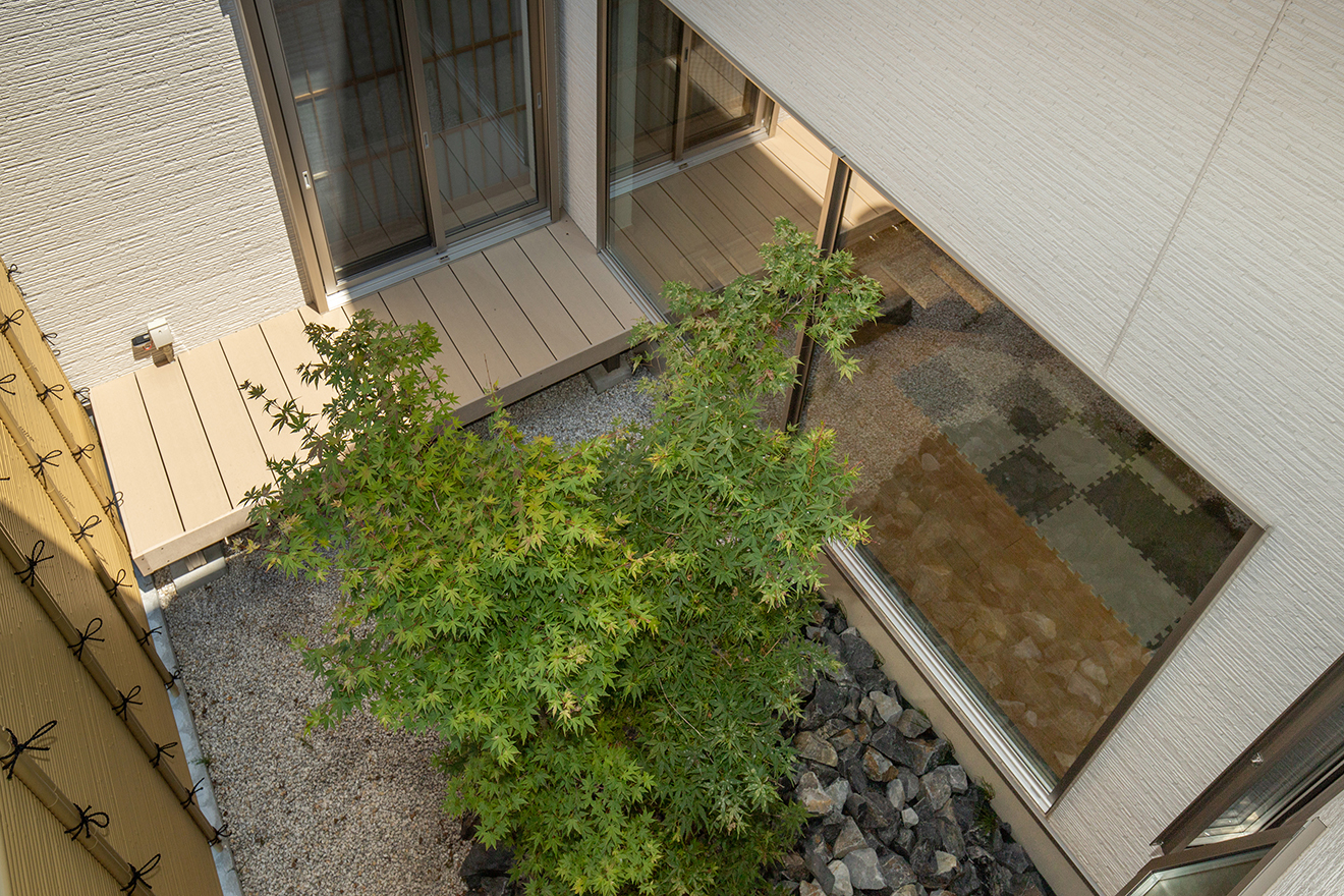【丸窓】ポイントとなる丸窓に内障子を設けることで空間の変化を楽しみ、和のテイストを引き込みました。 【中庭】隣地から目線の入らない、明るく開放的な空間です。