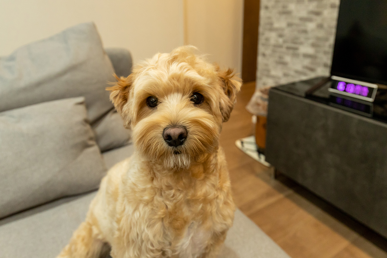 【ペットスペース】リビング空間にあるペットスペースは、クールな印象のブロック柄と落ち着いた色合いの床色でリラックスできる空間。毎日の暮らしに癒しを届けます。