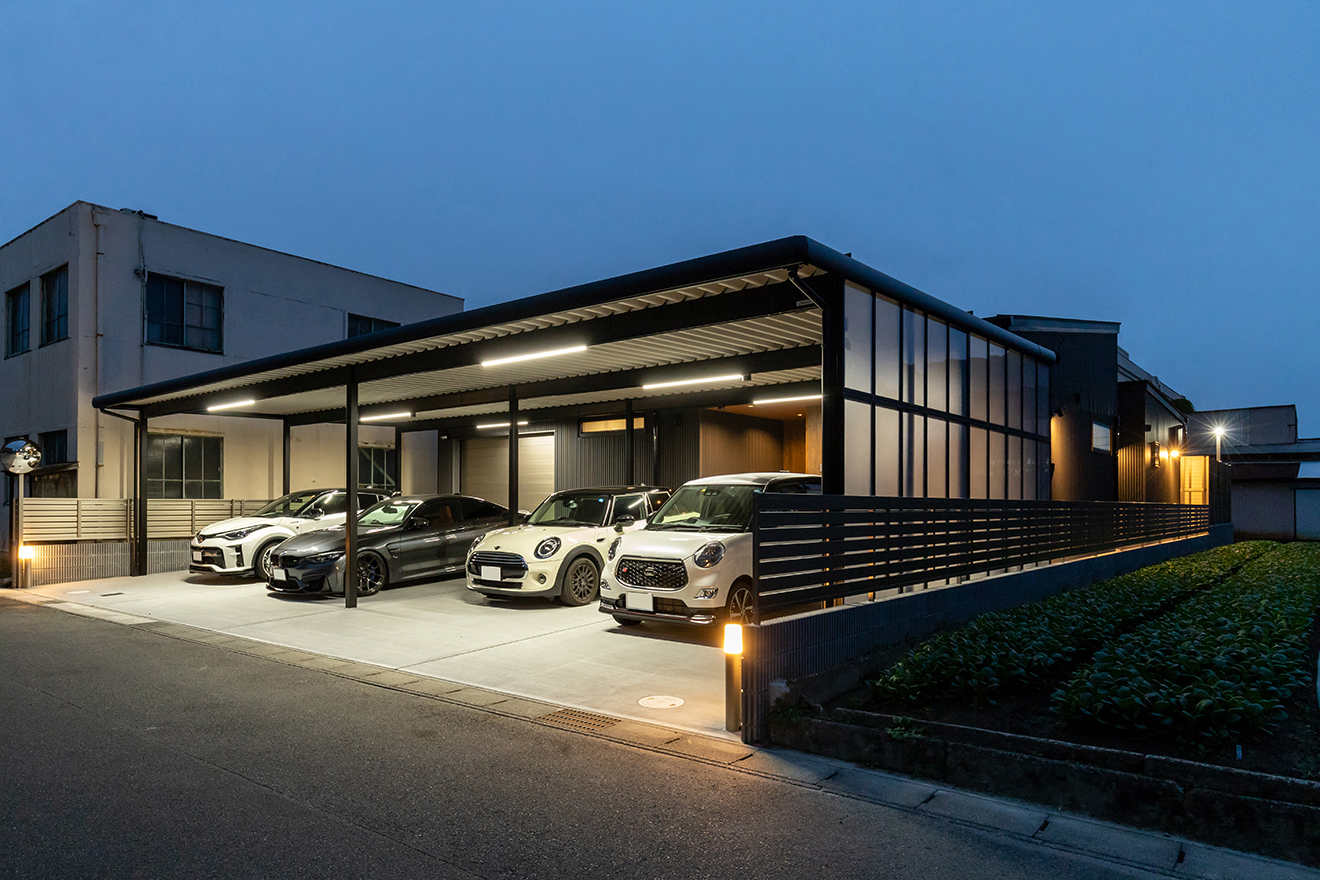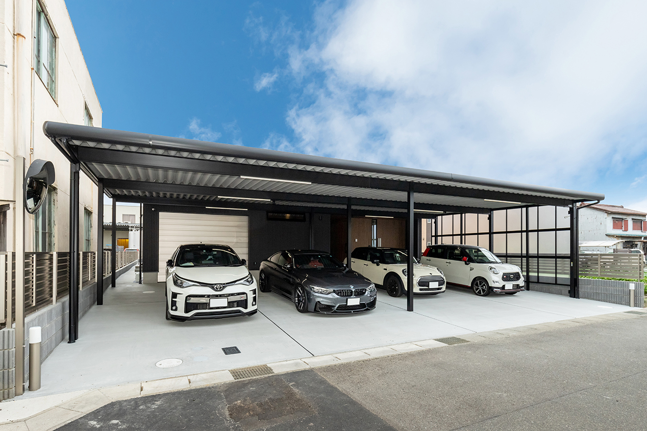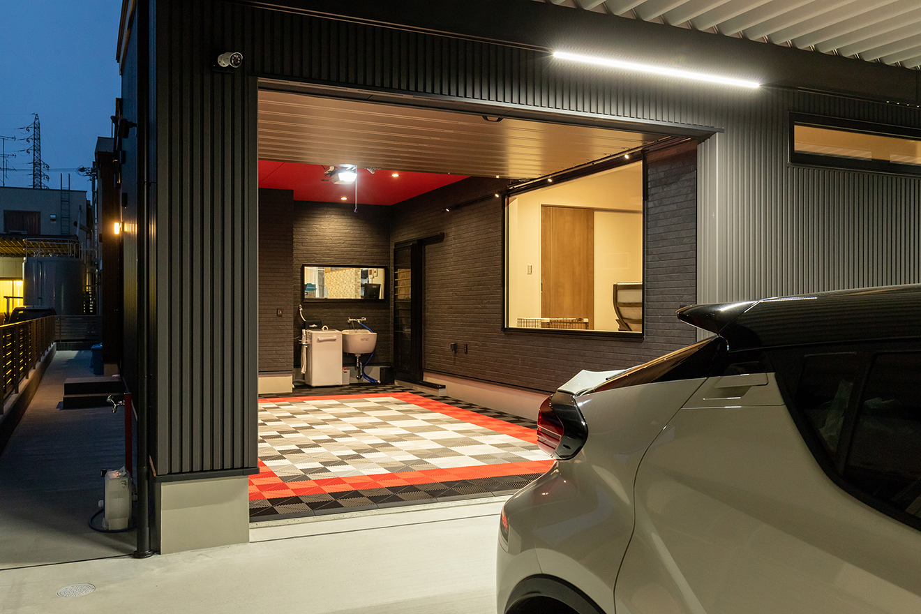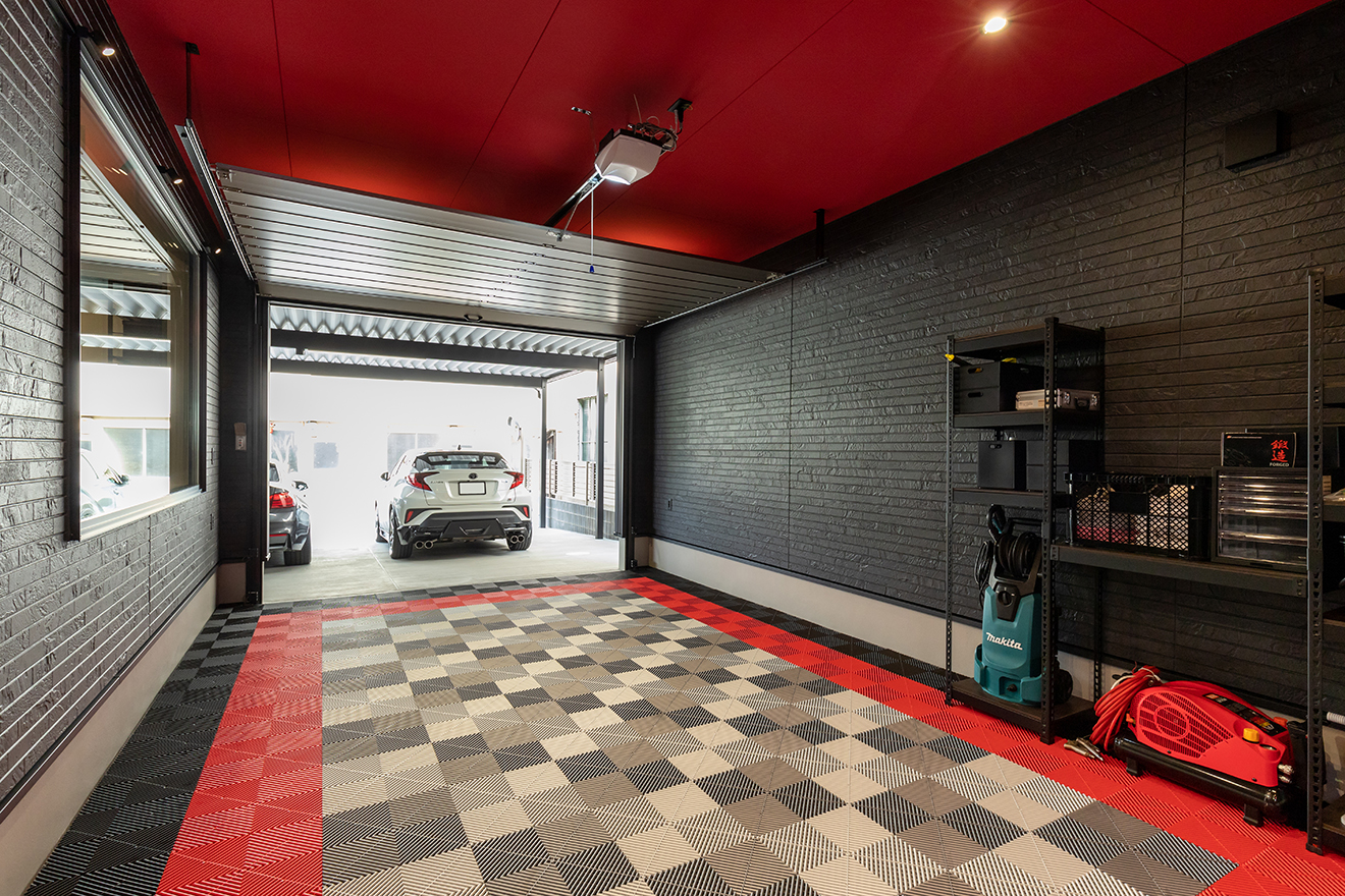 【ガレージ】オーバースライディングシャッターを採用したスタイリッシュなガレージ。思う存分愛車のお手入れができます。