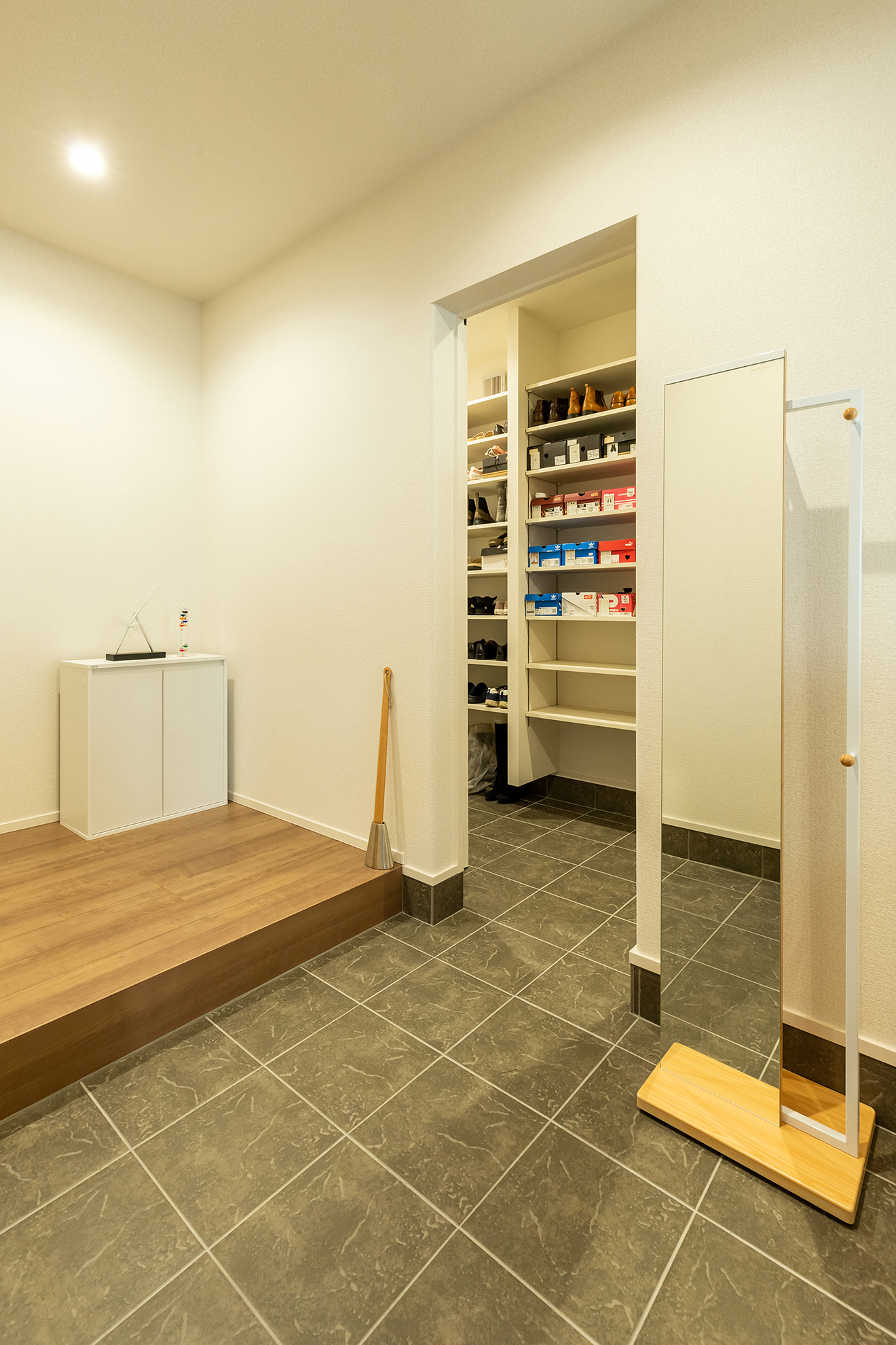 【外観】間口いっぱいのカーポート。ガルバ+木目調+オーバースライディングのシャッターが印象的な外観です。 【玄関】広々とした玄関スペースにはシューズクロークを隣接。