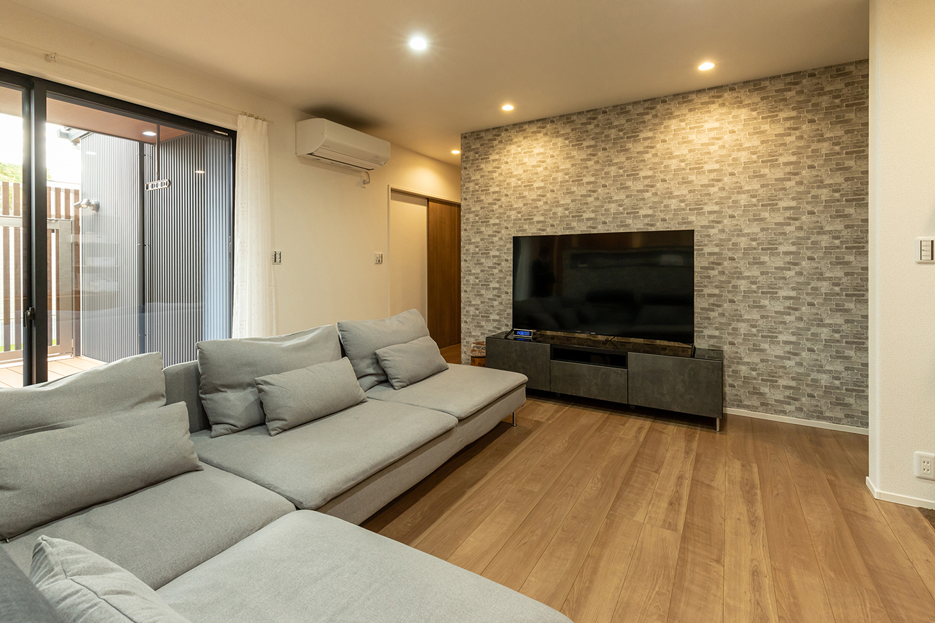 【リビング】TV背面の壁にアクセント柄を採用。南面にはウッドデッキを眺めることができる大開口サッシを配置。