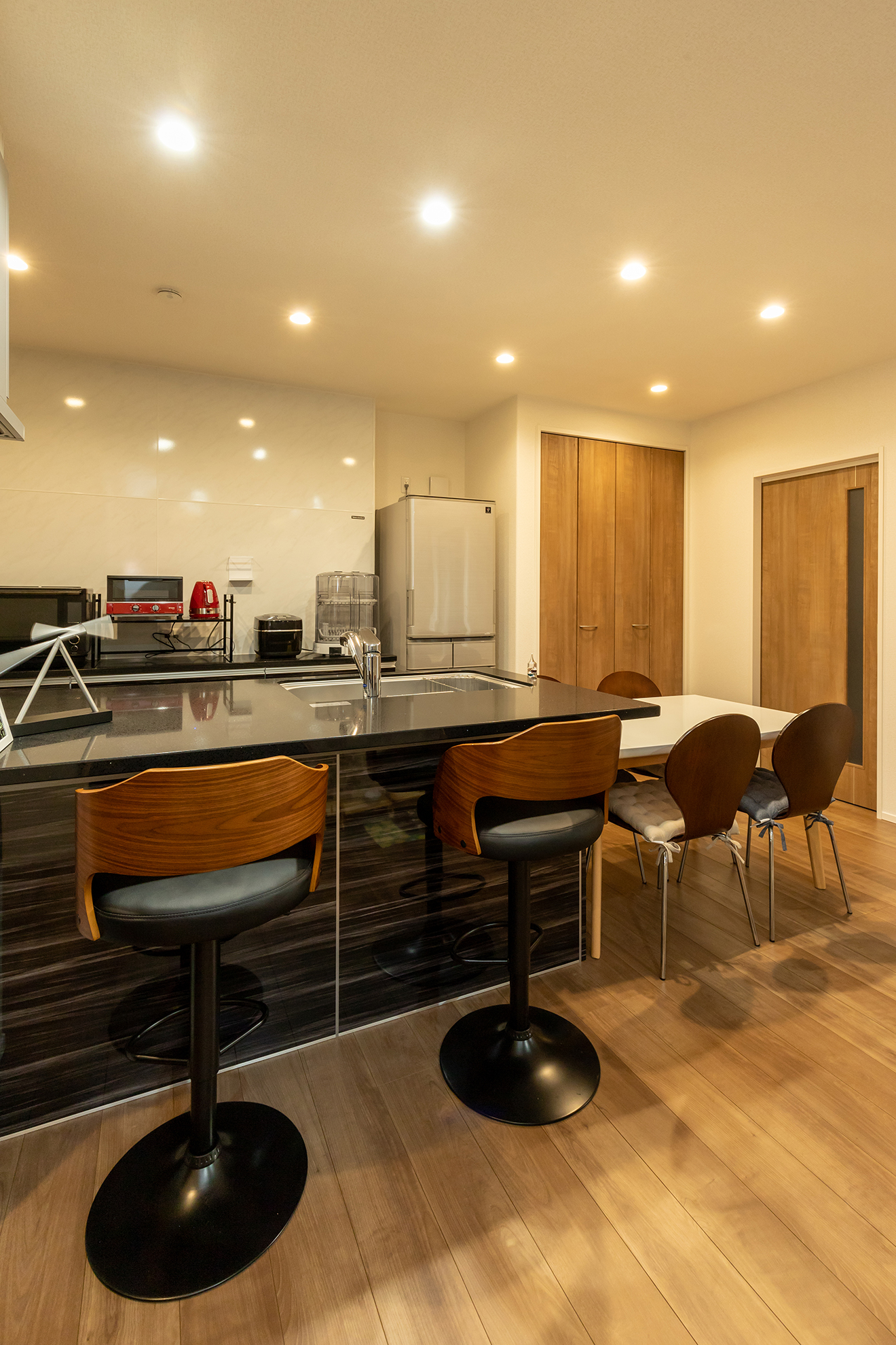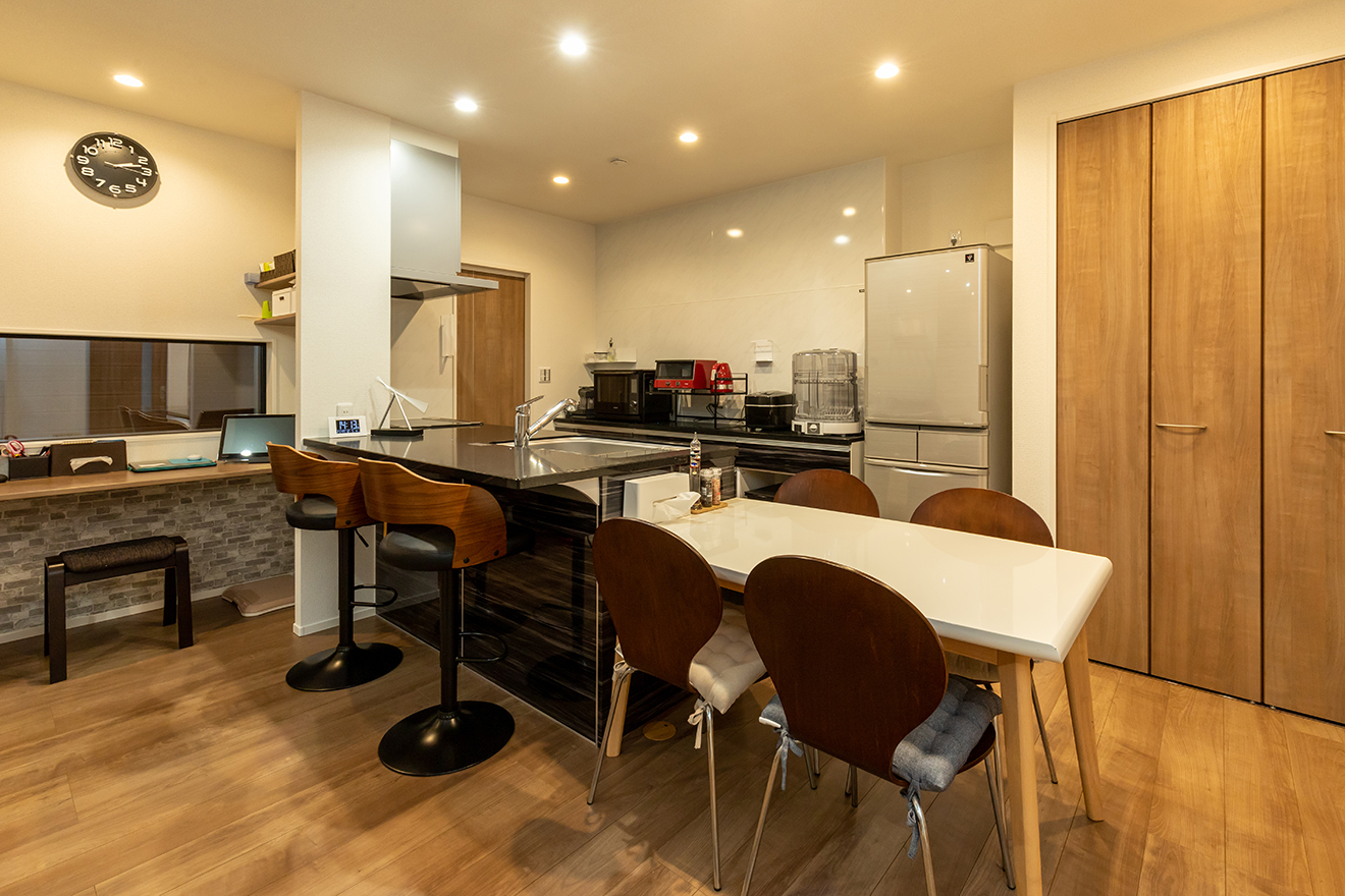 【ダイニング】セミフラットキッチンのサイドに書斎スペースを設けることでガレージの愛車を眺めることが出来ます。冷蔵庫スペースの壁を凹ませてスッキリとした印象にまとまっています。