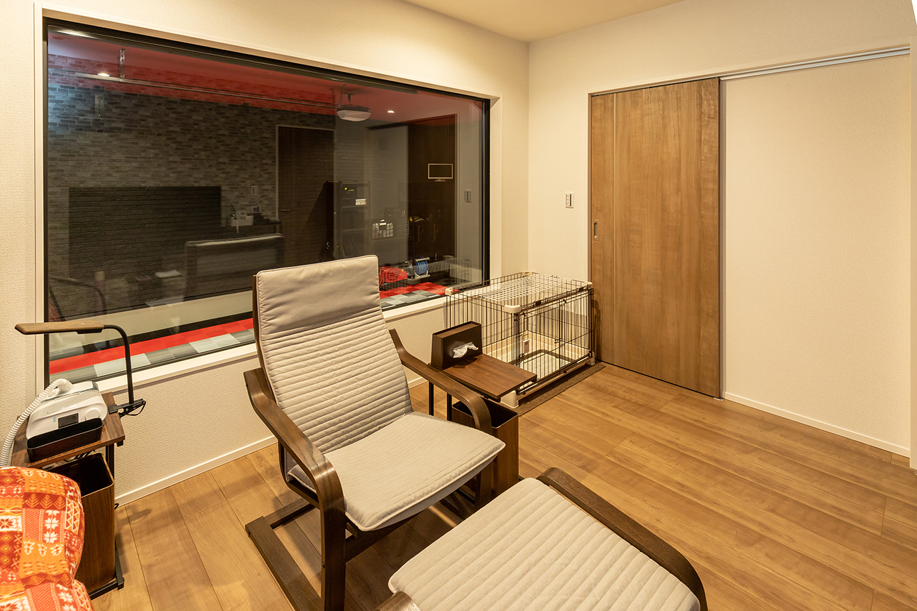 【寝室】寝室からガレージを眺められるピクチャーウィンドウ。自分だけの特別な空間です。