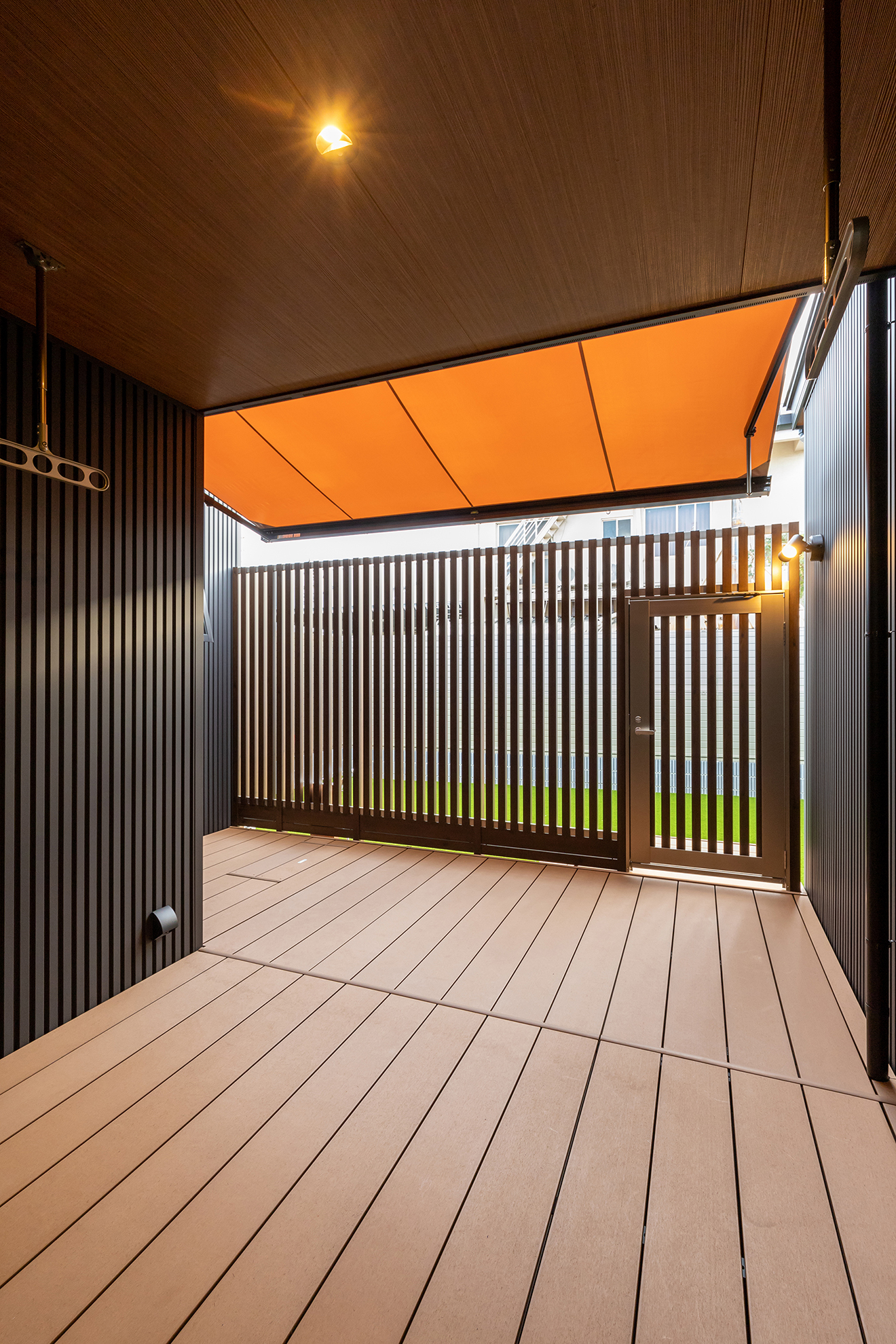 【ウッドデッキ】軒のあるウッドデッキは夕涼みやペットと遊ぶのに最適な空間。目隠し格子で外部からの視線も気になりにくいです。 【庭】愛犬が安心して自由に遊べるドックランを設けました。