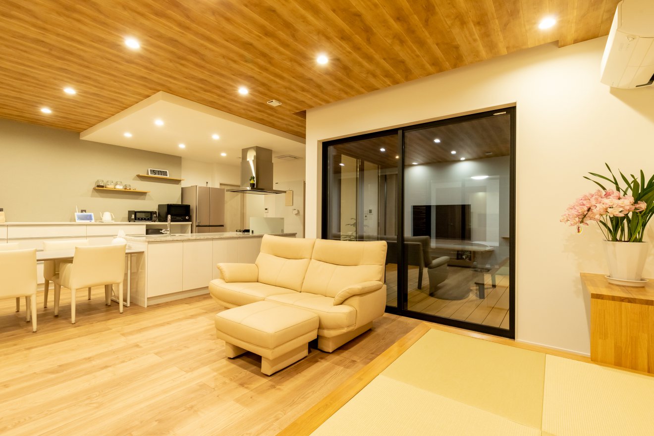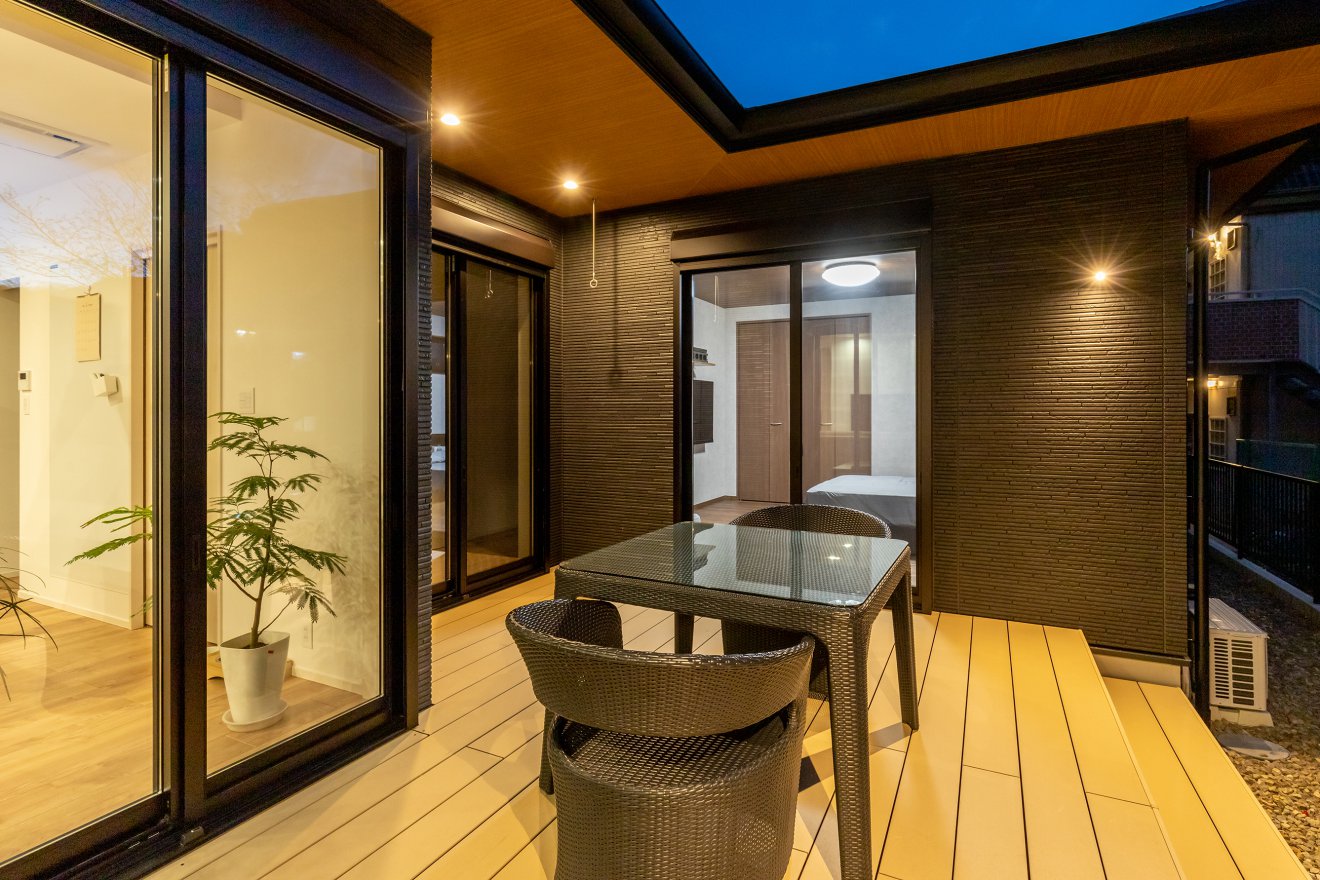 【夜景・中庭】LDKと繋がるテラス。お風呂あがりに夜空を見ながら飲むビールは格別です。 【夜景・キッチン】キッチンを折下げ天井にし空間を緩やかに仕切りました。