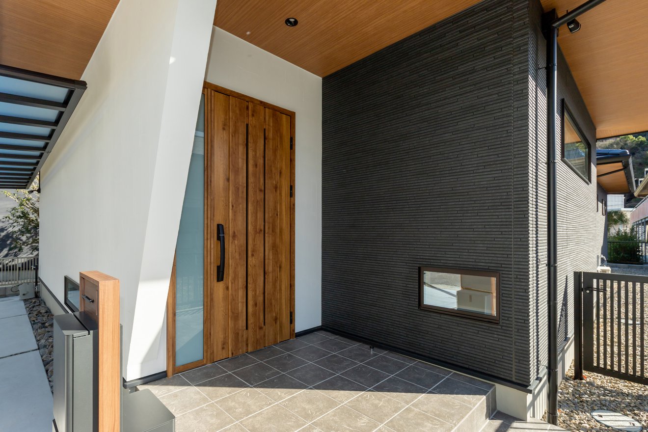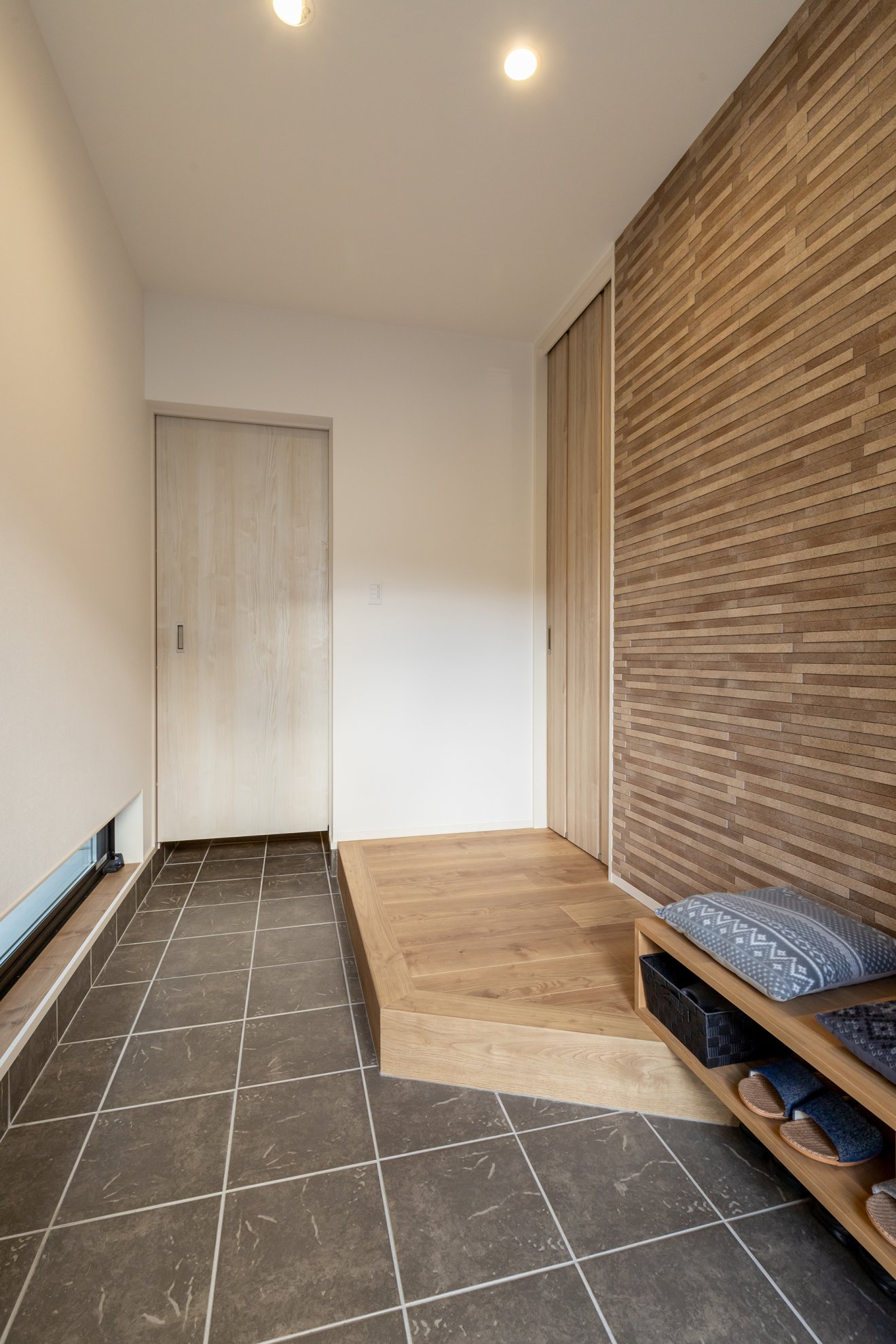 【玄関】斜め壁が特徴的な玄関。外壁の一部をジョリパットで仕上げ、質感を際立たせました。スリッパなどを仕舞える玄関収納はベンチとしても使えます。腰掛けたり、荷物を一時置きしたりと便利です。