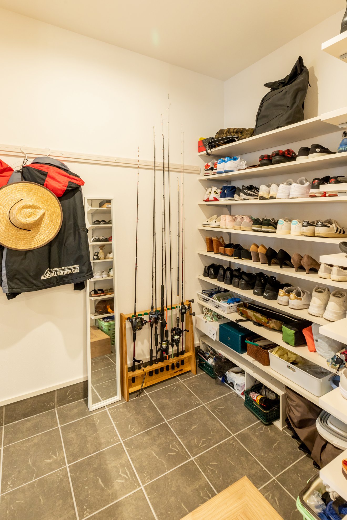 【土間収納】靴やコートにバッグ、雨の日の傘やレインコートも収納しておけます。趣味の釣り道具のメンテナンスも十分出来る広さです。 【LDK+中庭】猫ちゃんと寛ぐLDKに中庭を配置。