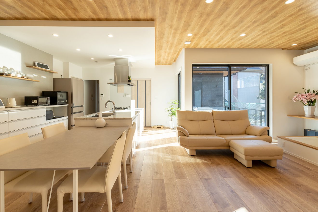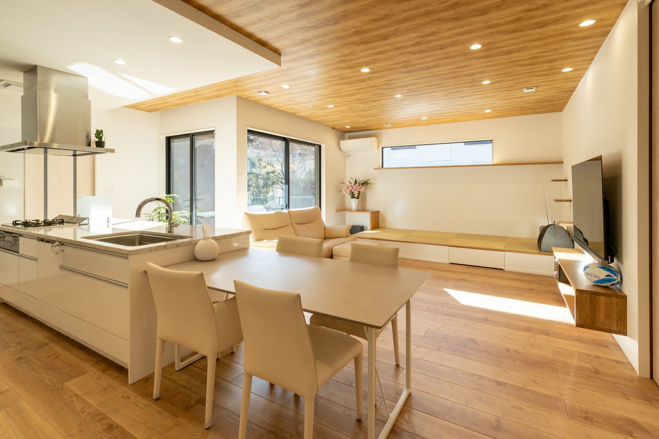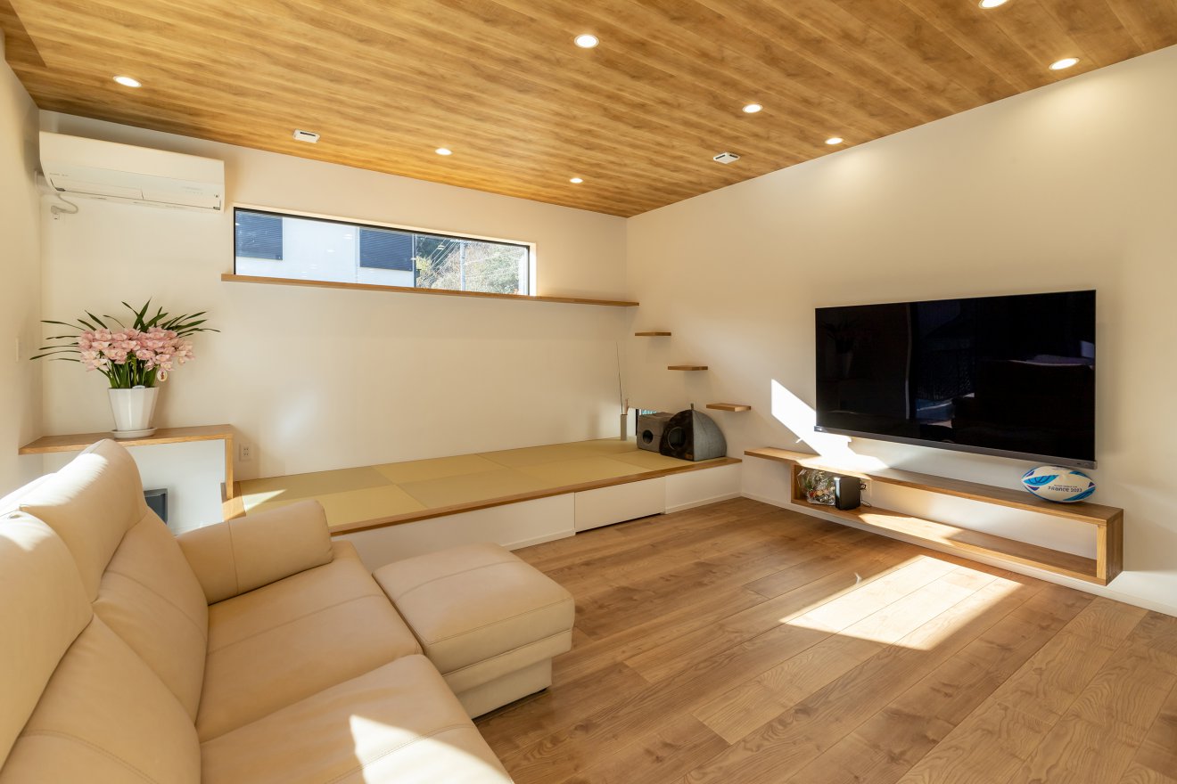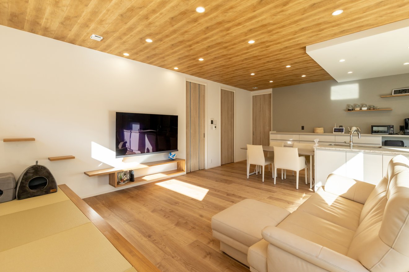 【LDK】TVボード兼用の猫ステップ。猫ちゃんが伸び伸び遊ぶ姿は家族の癒しの時間になります。天井には木目調クロスを採用。空間により奥行が生まれました。