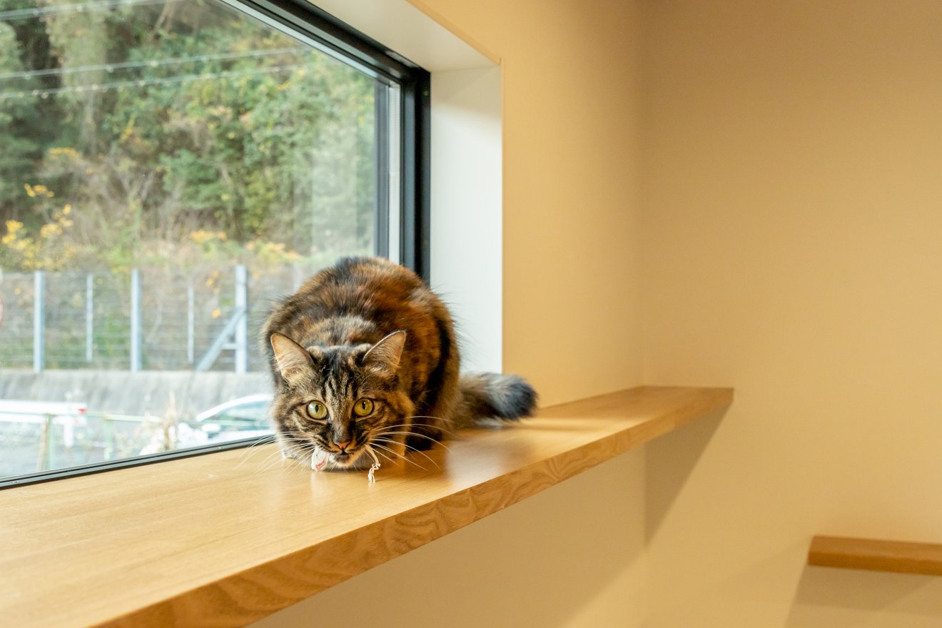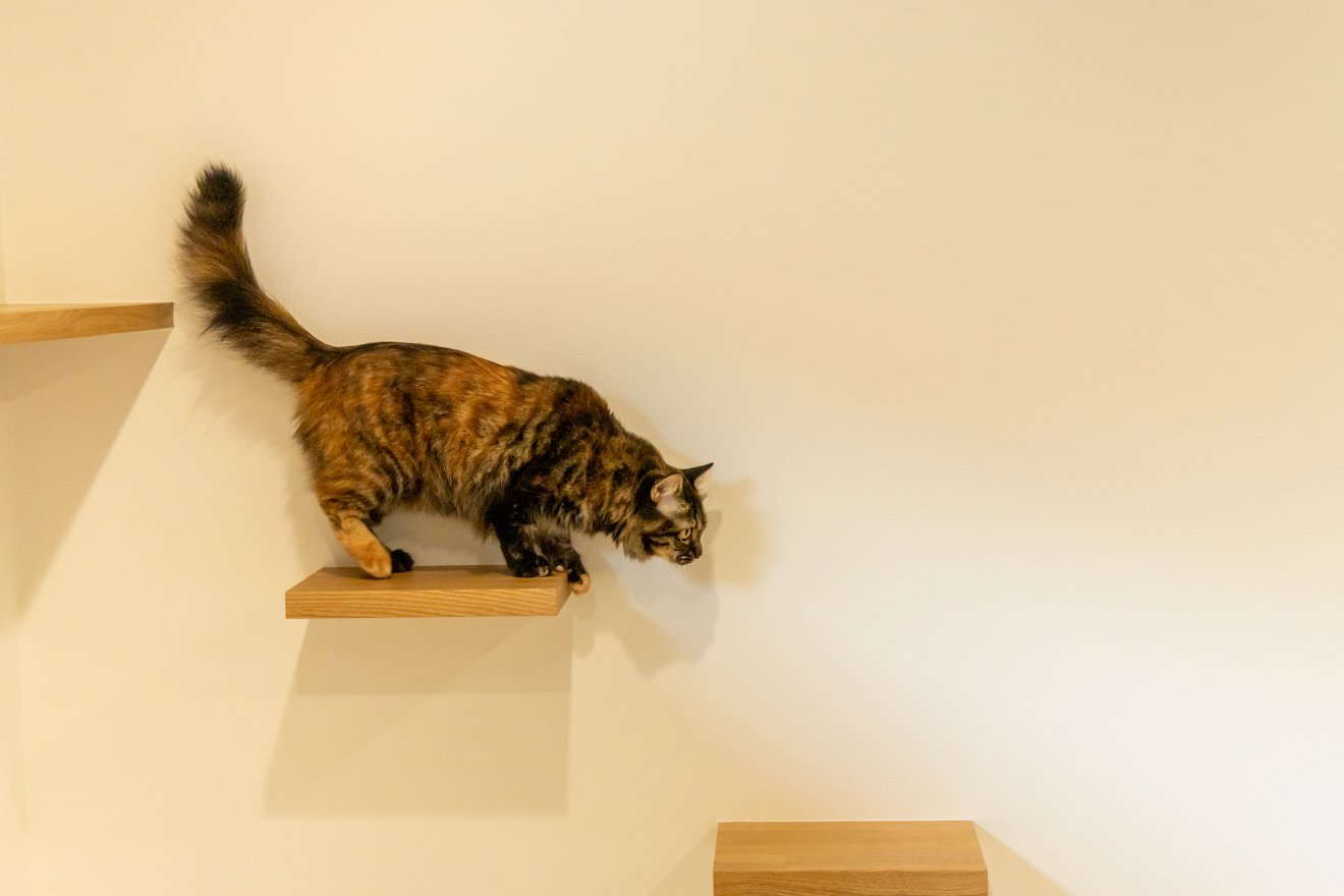 【猫ステップ】我が家の猫ちゃんのお気に入りスペース。暖かい光が降り注ぐおひるね場所。次のステップを確認しながら進みます。たまに大きなジャンプも。思う存分遊べます。