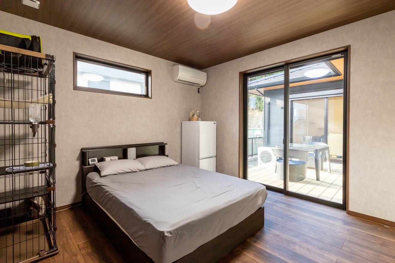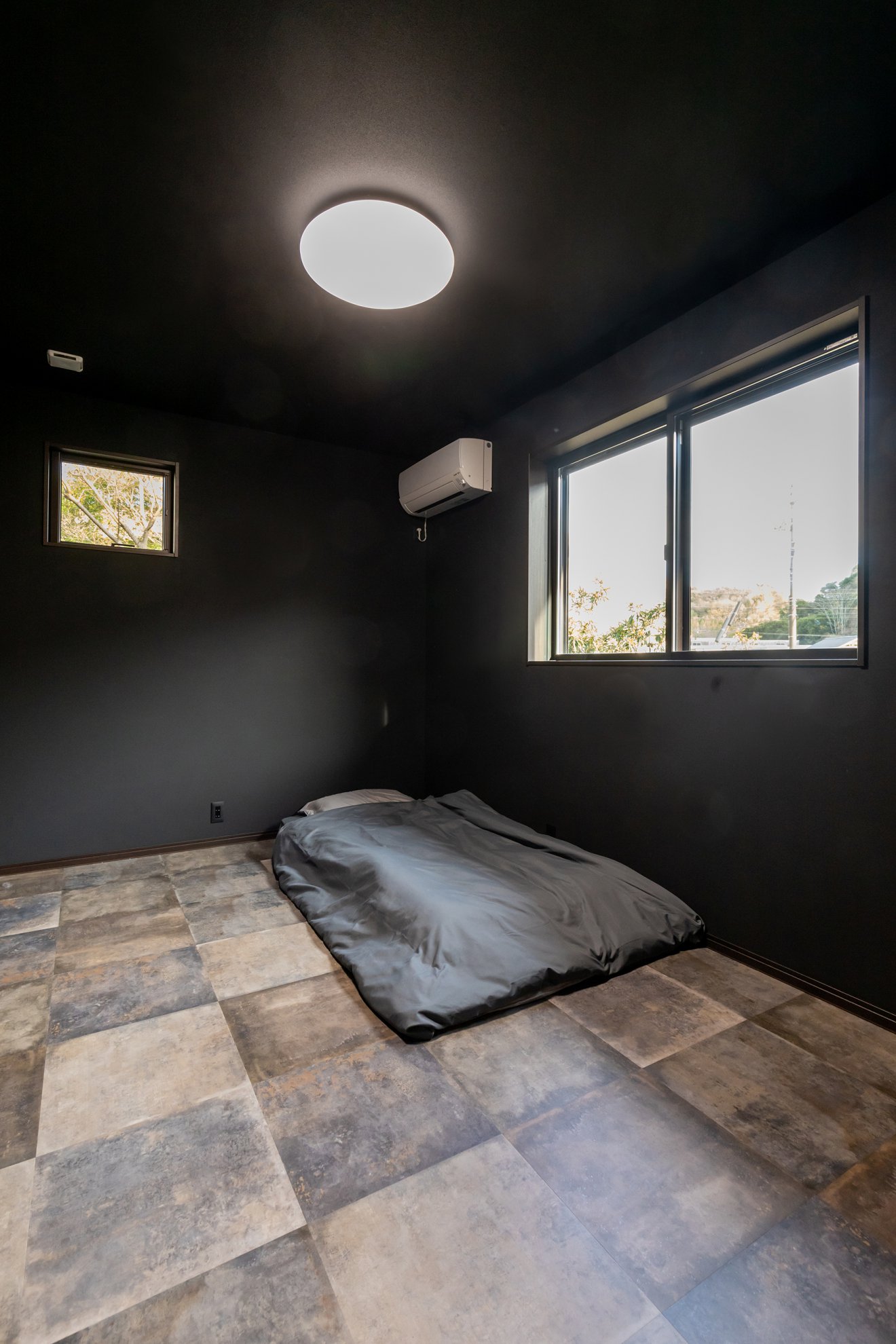 【寝室】中庭と繋がる主寝室。ダークブラウンの色味で落ち着ける空間に。 【子供部屋】モノトーンカラーでクールにまとめました。床はフロアタイルで清掃性もバッチリ。