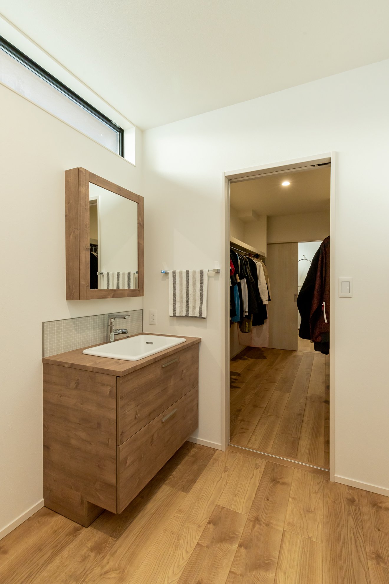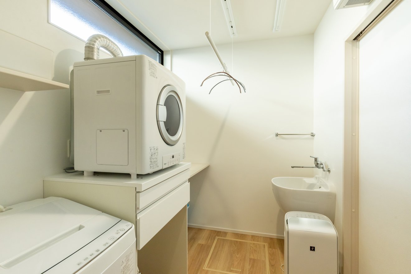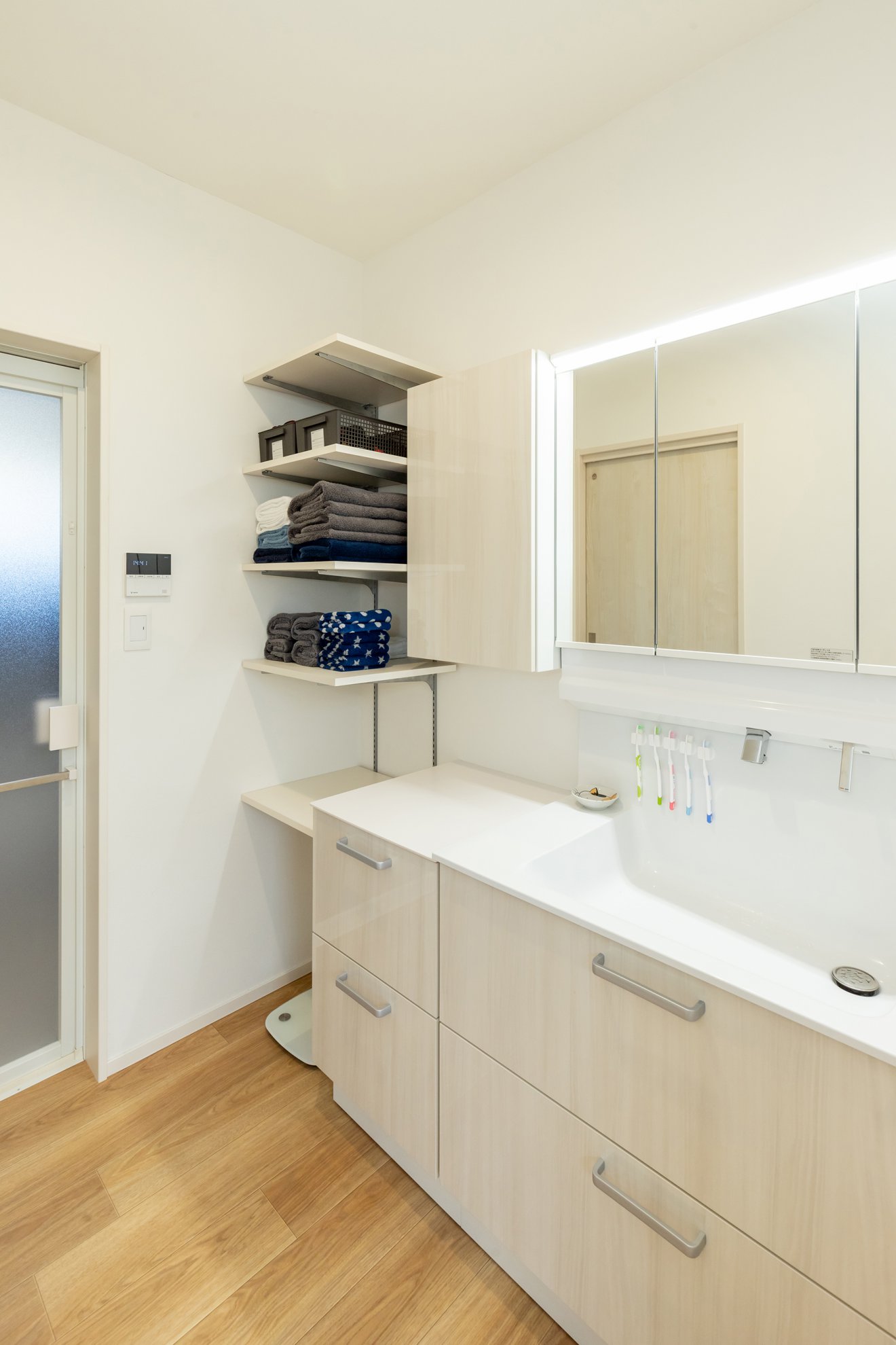 【洗面】朝の支度などで家族の渋滞を避けるため、セカンド洗面を設けました。 【ランドリールーム】清潔感のあるホワイトカラーで統一。人気の幹太くん、スロップシンクも設置。