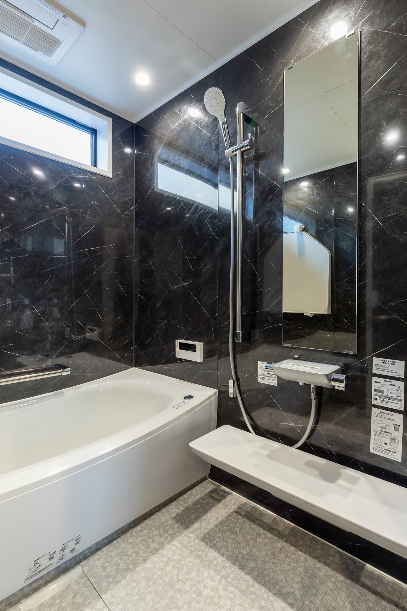 【脱衣室】家族がゆったり使える大きな洗面台。 【お風呂】高級感あふれるラグジュアリーなお風呂で一日の疲れを癒します。