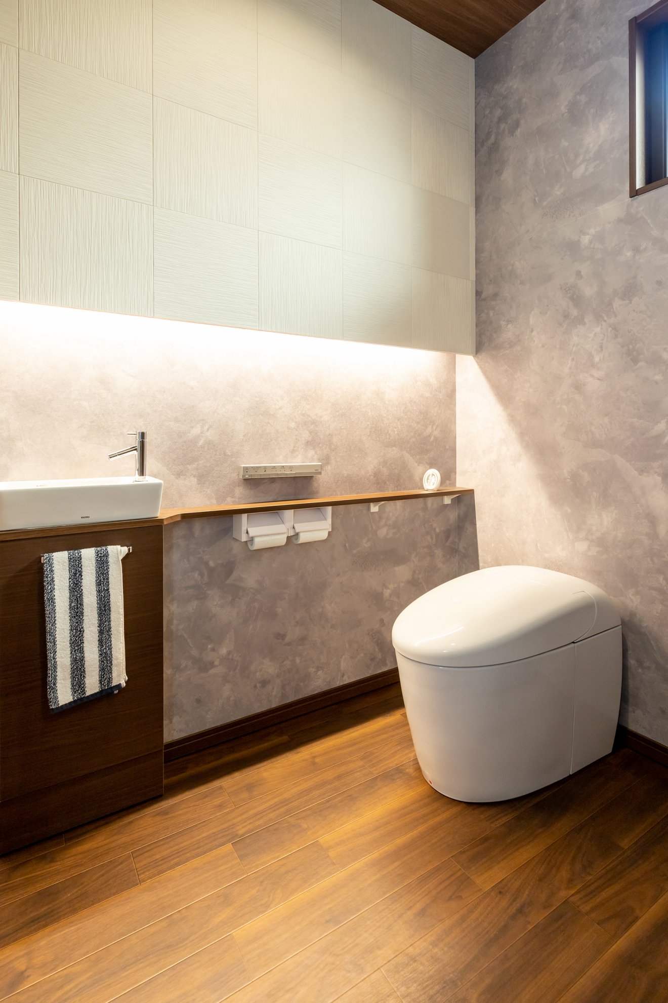 【トイレ】間接照明+エコカラットでおしゃれ且つ快適な空間に。 【夜景・外観】屋根や壁が生み出す陰影が美しい外観。