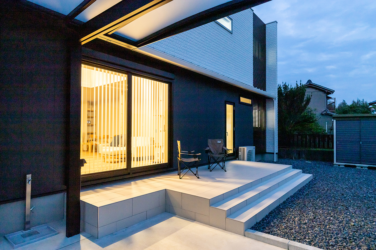 【夜景・テラス】大きな窓からこぼれる光。夕涼みなどを楽しめる広々テラスです。 【夜景・LDK】暖色の灯りが吹き抜けから広がります。リビングに温かい空間を演出しました。