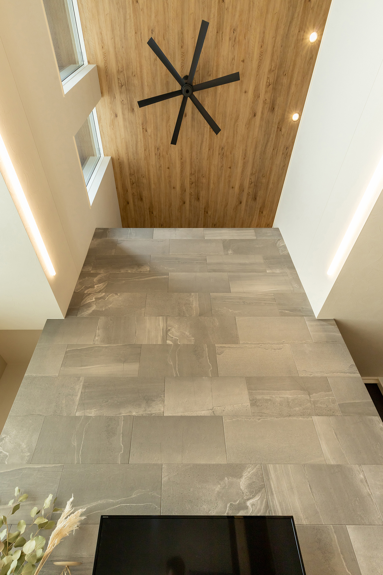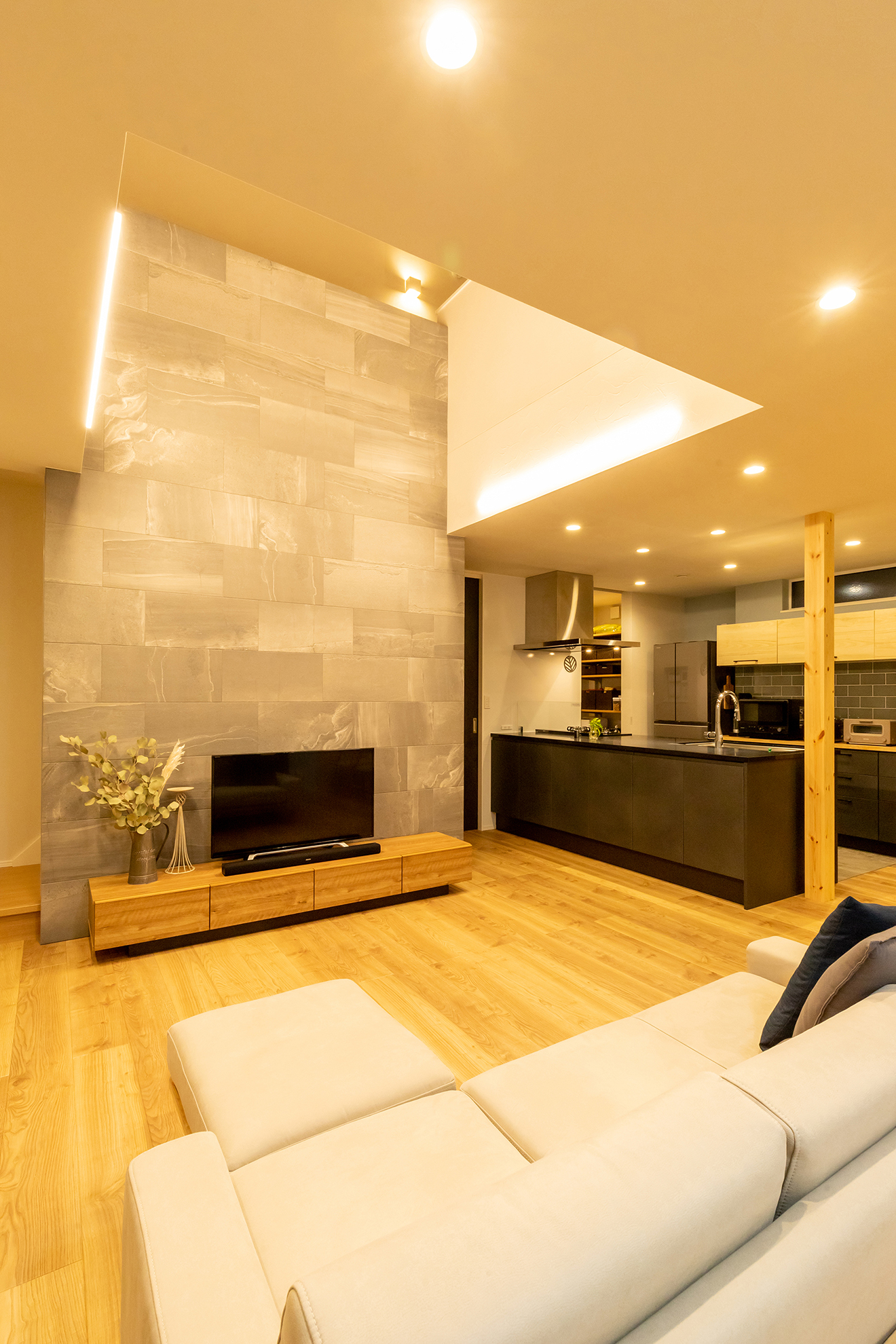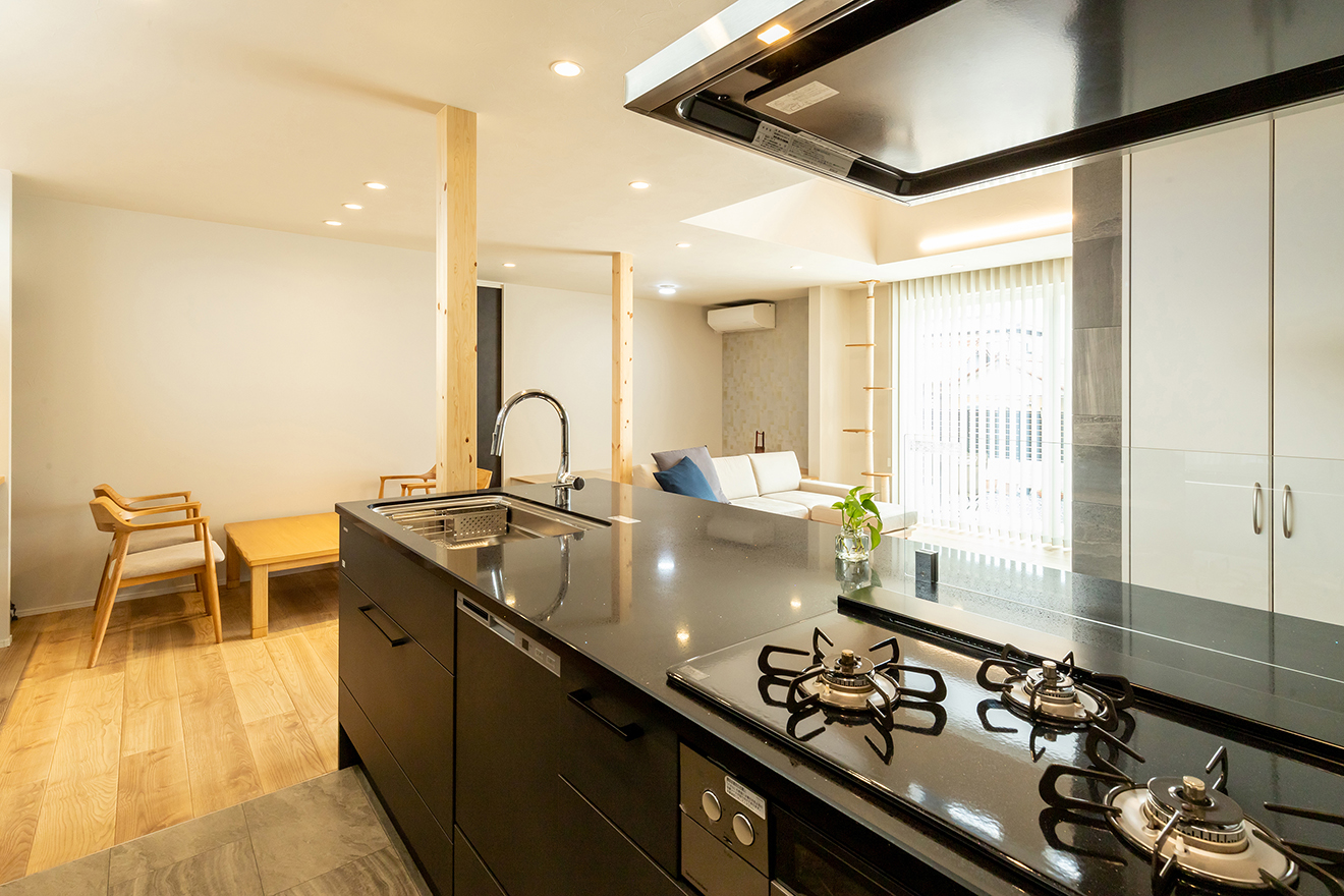 【キッチン】ブラックでまとまったキッチンはLDKのオブジェとなる存在に。床にフロアタイルを貼り、お洒落で手入れもしやすくキレイが保てます。 【吹き抜け】大伴のエコカラットを木目調の天井と組み合わせました。落ち着いたモノトーンカラーが住まいの雰囲気に合います。