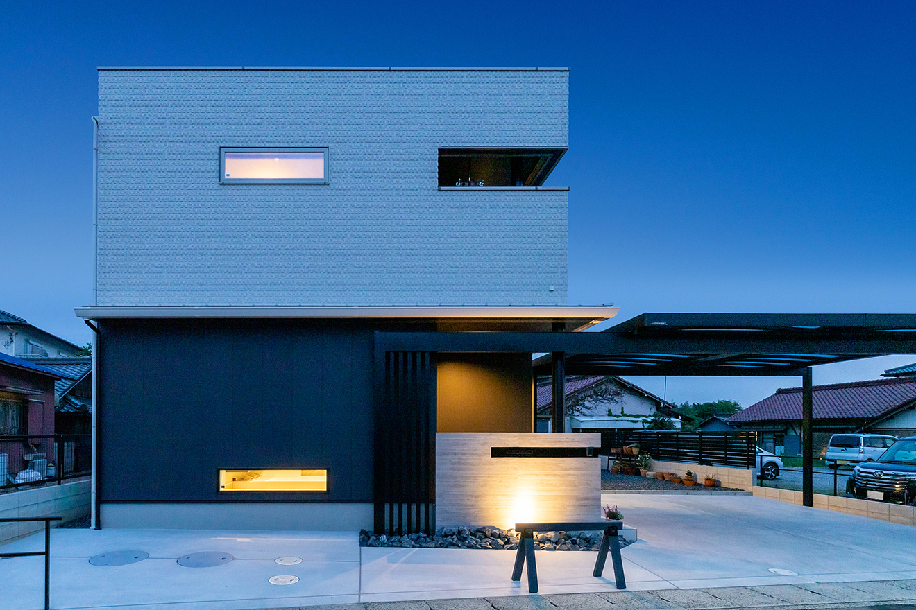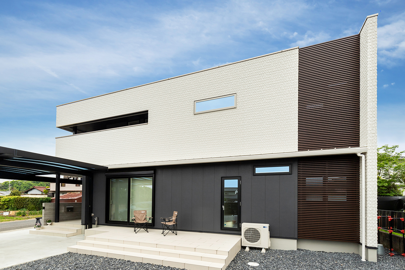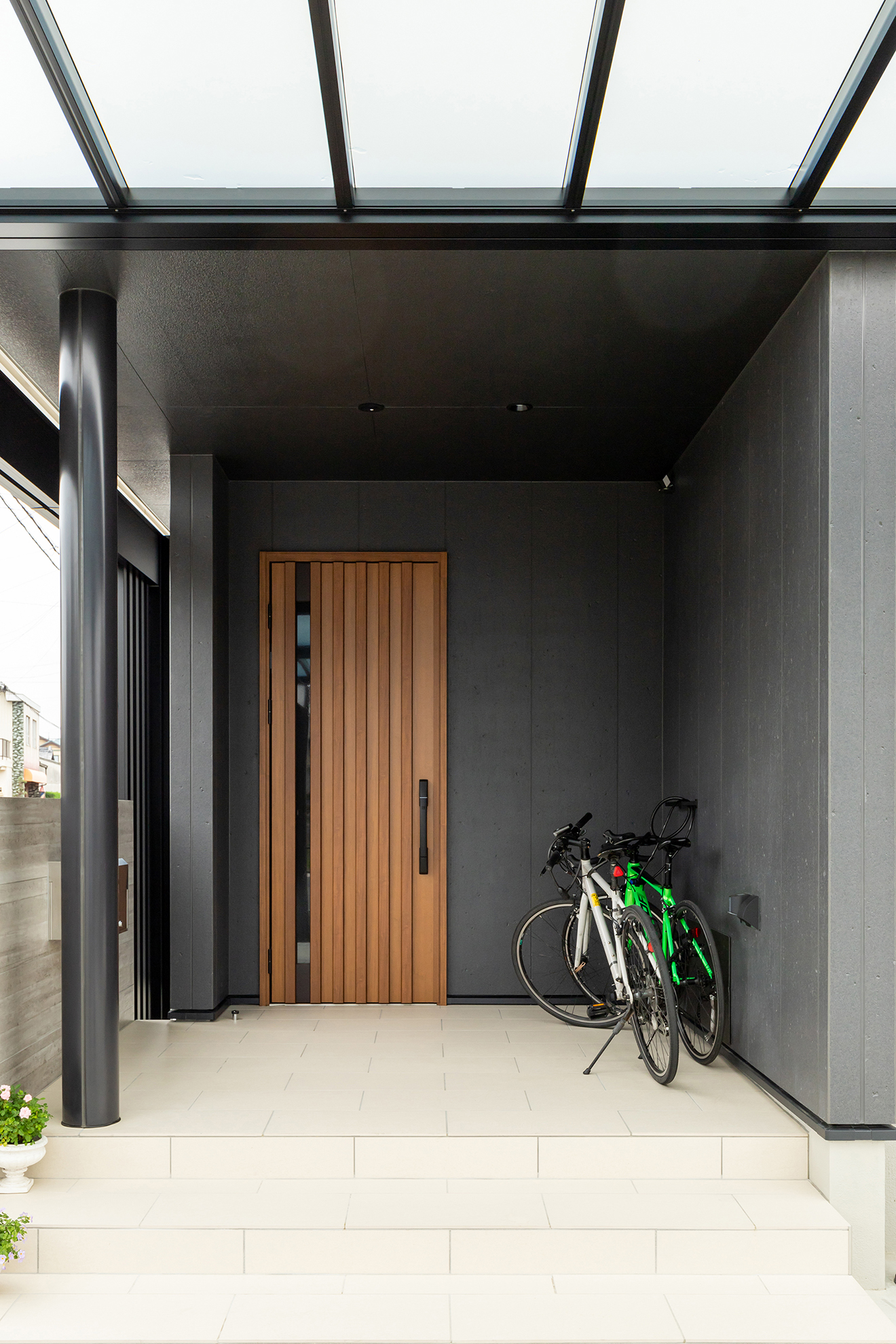 【外観】上下で分けた外壁。下部は縦貼りにすることでスタイリッシュに仕上がりました。木目調の横格子が外観のアクセントに。 【玄関】軒の深い玄関ポーチ。ブラックを基調とした中に木目調の玄関ドアが映えます。