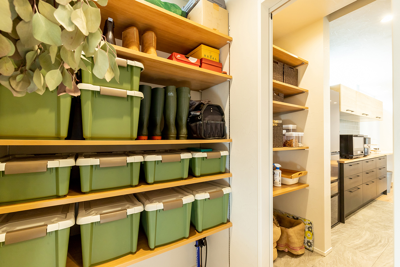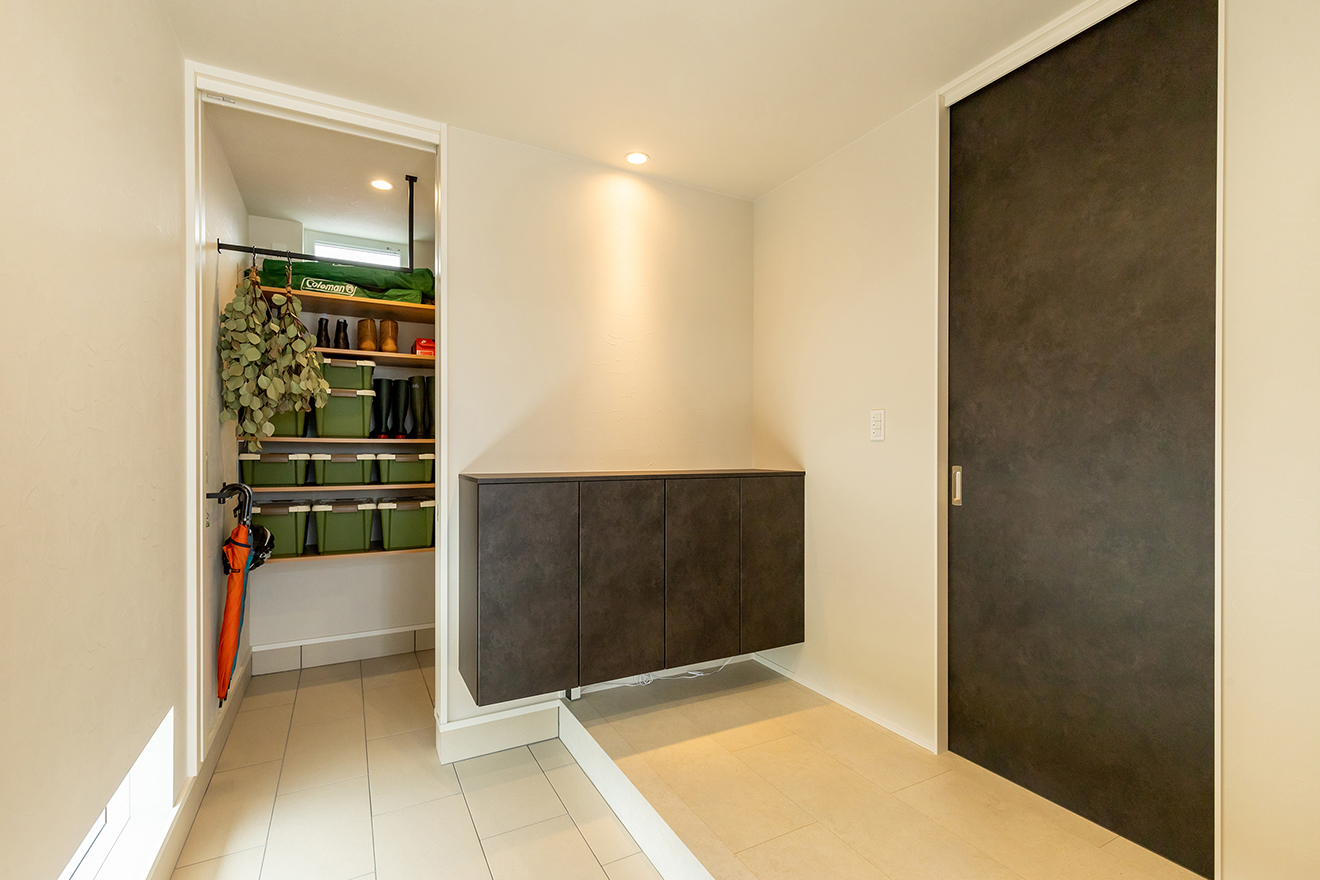 【玄関ホール】フロートタイプの玄関収納に照明を配置。季節物を飾ったりと楽しめます。玄関タイルと床材はまとまりある色合いに。 【家事動線】シューズクローゼットからパントリーへ抜ける動線です。シューズクローゼットには色合いを揃えたBOXで統一。